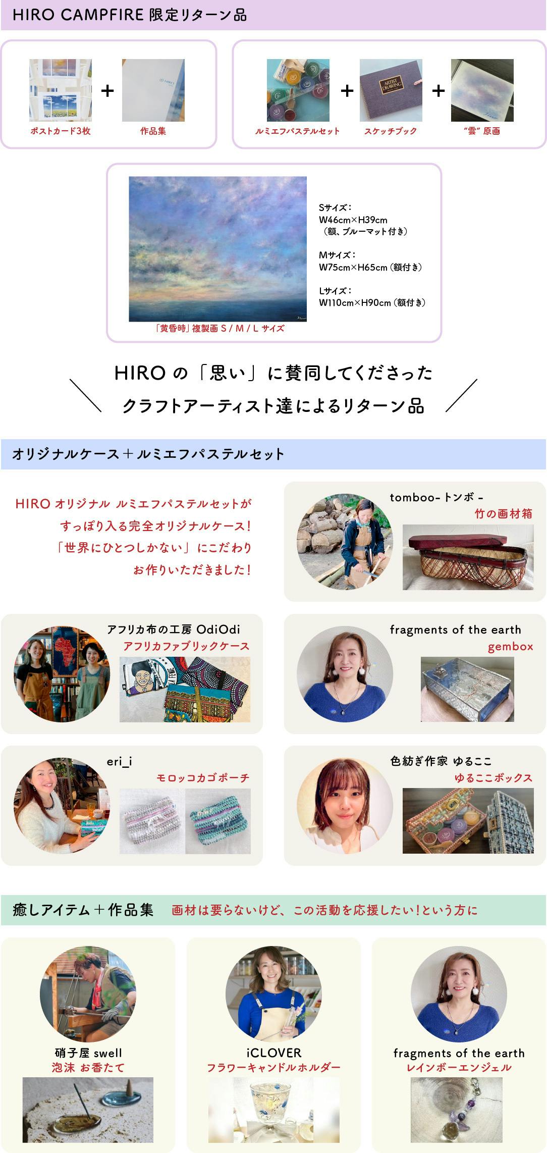 今回の「ルミエフパステル」誕生にあたって、HIROの想いに共感いただいた作家さんたちにお願いをしてリターン品をご用意させていただきました。作家さんお一人お一人に、この開発に込めた想いなどをお話しさせていただき、リターン品でも数々コラボが実現しました!