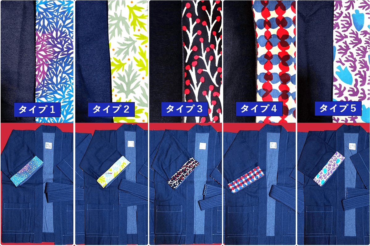 塩澤商店の【はんてんの袖口オーダーメイド】の特別版です。Doucattyさんの5種類のてぬぐいを選びました。