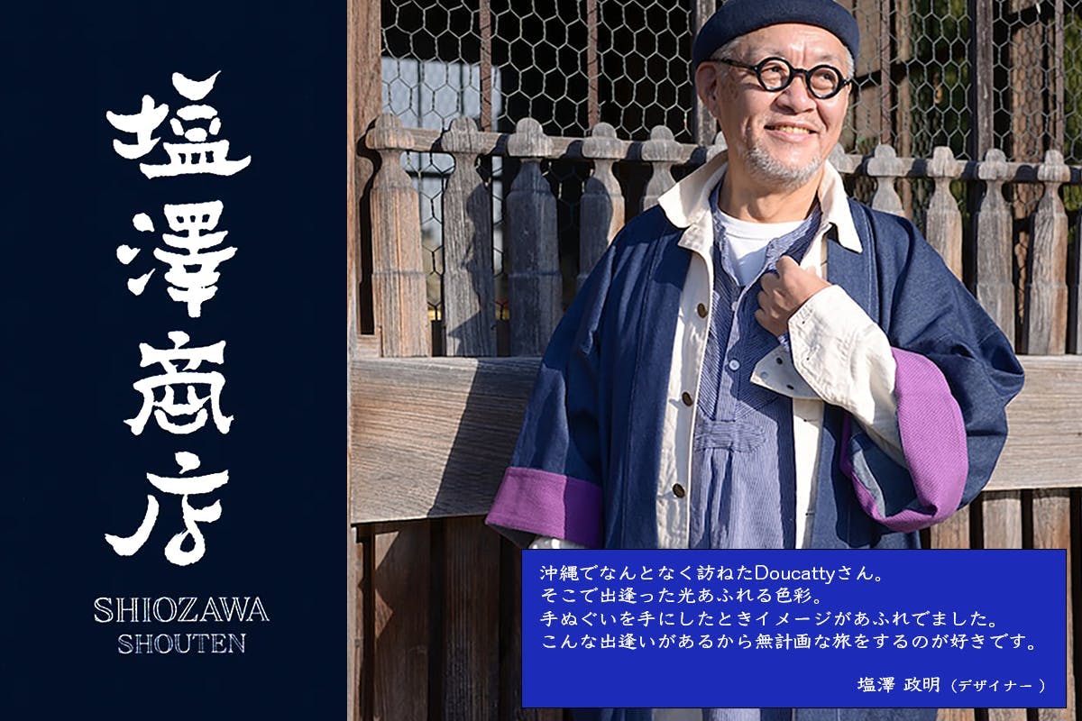 沖縄でふらりとDoucattyさんへ立ち寄った。路地からバナナの木をくぐって建物の奥へ入っていくと天井の高い工房が。沖縄の光のような色彩の布の自由な群舞に出逢ったような衝撃、感動。あ、手ぬぐいで塩澤商店の人気アイテム「デニムはんてん」の袖口にしたらと夢が膨らんだ。あれから3年が経って、やっとカタチに。ぜひ、たくさんの方々に楽しんでもらいたいです。