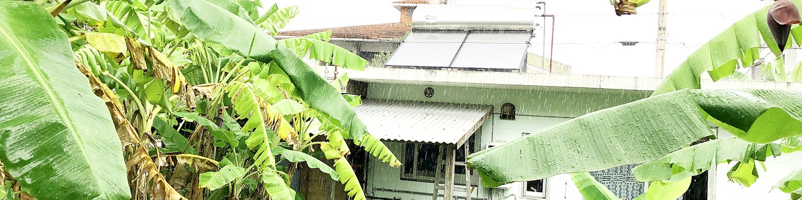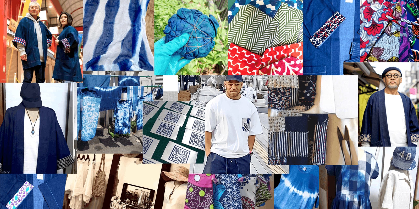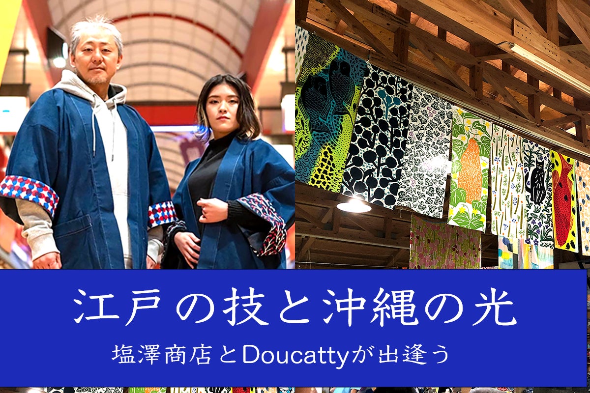 沖縄でふらりとDoucattyさんへ立ち寄った。路地からバナナの木をくぐって建物の奥へ入っていくと天井の高い工房が。沖縄の光のような色彩の布の自由な群舞に出逢ったような衝撃、感動。あ、手ぬぐいで塩澤商店の人気アイテム「デニムはんてん」の袖口にしたらと夢が膨らんだ。あれから3年が経って、やっとカタチに。ぜひ、たくさんの方々に楽しんでもらいたいです。