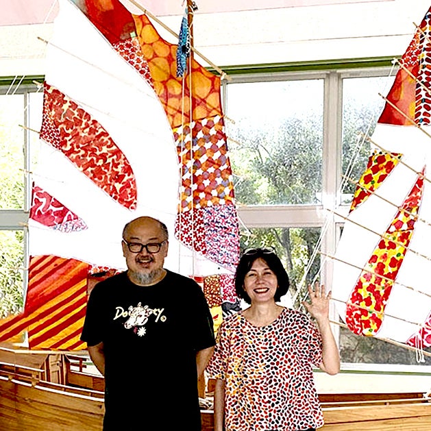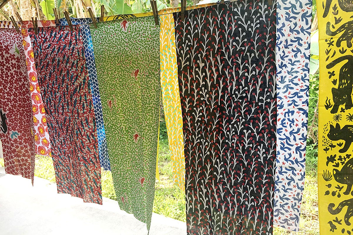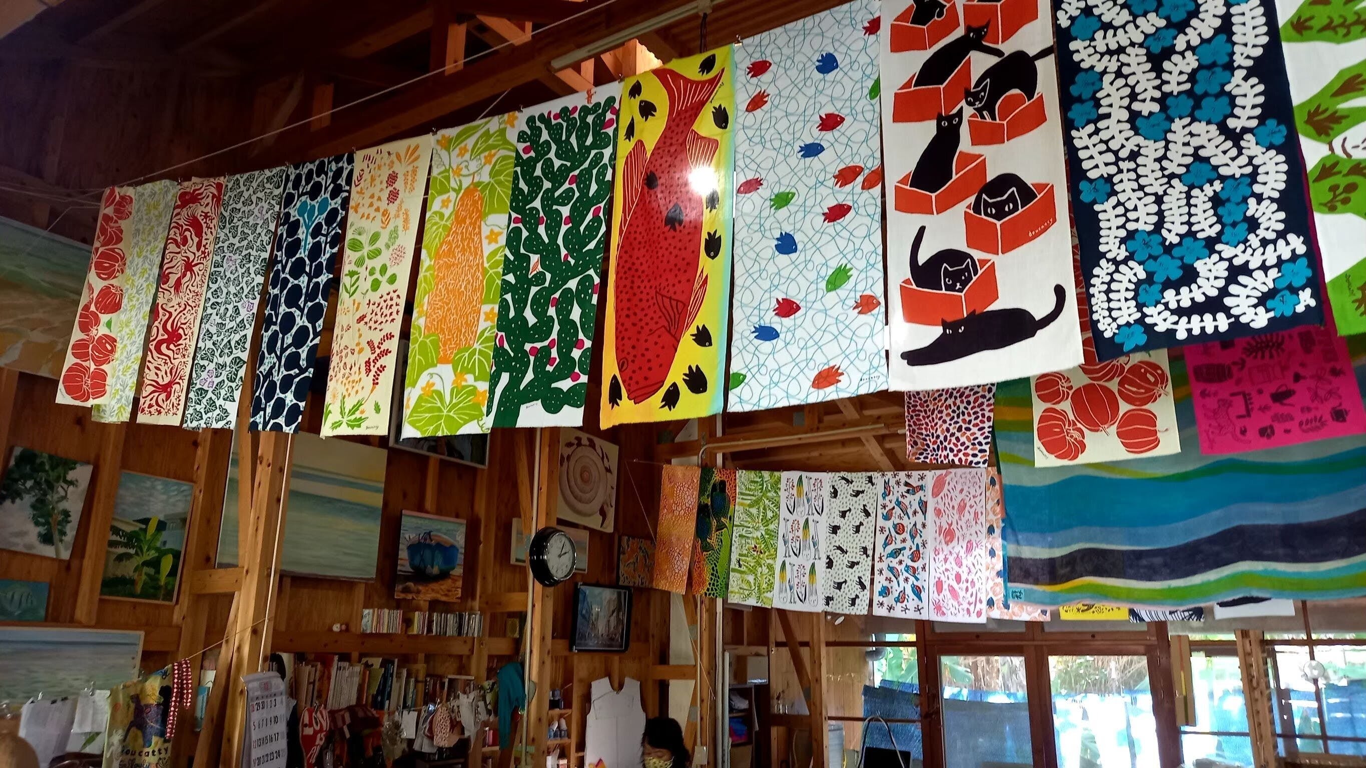 田原幸浩さんと田原琴子さんが、色彩豊かな沖縄の光、自然を自由で楽しい作品を制作しています。バナナの木が茂る庭を通り抜けると工房があります。すべてオリジナルの絵、デザインばかり。制作中の布地が天を舞い、ショップには手ぬぐいやTシャツ、一点ものの手描き手染め作品が並んでいます。