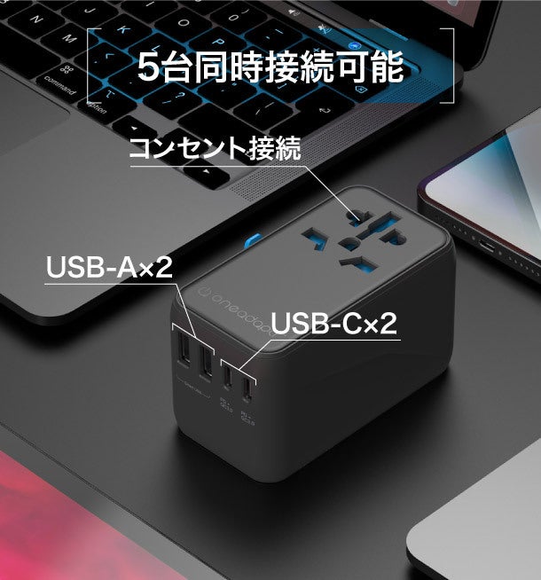 OneWorld100は日本のコンセントソケットに加え、USB typeAポートが2つ、USB typeCポートが2つの合計5つの接続口を完備し、最大で同時に5台のデバイスの給電・充電が可能です。