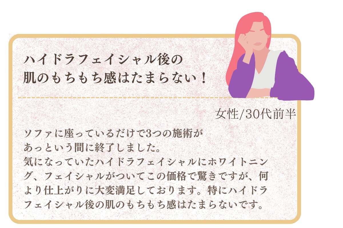 【施術時間】45〜60分※当店のハイドラフェイシャルマシンは、医療機器ではありません。また、肌トラブルが発生しないようピーリング溶剤の濃度を抑えたものとなっており、医療行為には該当しません。