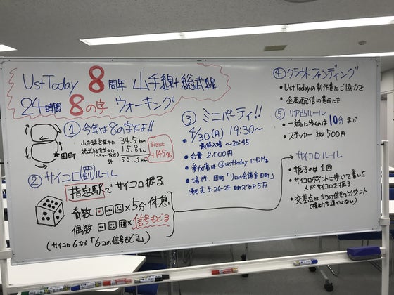 ついに本日5月13日23:59いっぱいでプロジェクトが終了します。 19:30現在、支援して頂いた方は述べ70名、支援金額は567,392円(目標金額800,000円)。4月30日時点の429,072円以降も皆さまからのご支援を頂戴したものの、昨年より支援して頂いた方の人数や支援金額を超えていない状況です。 ということで、最後の最後のプロジェクトへの支援を呼びかけるべく、この後2018年5月13日21時ぐらいから「UstToday配信8周年記念山手線24時間ウォーキング」のプロジェクト大反省会をライブ配信します。 配信予定のチャンネルは下記の通りです。 ツイキャス: http://twitcasting.tv/UstTodayUstream: http://www.ustream.tv/channel/usttodayYouTube Live: https://www.youtube.com/channel/UCO8xDf1o-s7JOIEwxKA_8yAFacebook Live: https://www.facebook.com/UstToday/ニコ生: http://ch.nicovideo.jp/UstTodayFresh!: https://freshlive.tv/usttoday 状況により配信ができないチャンネルもあります。予めご容赦ください。