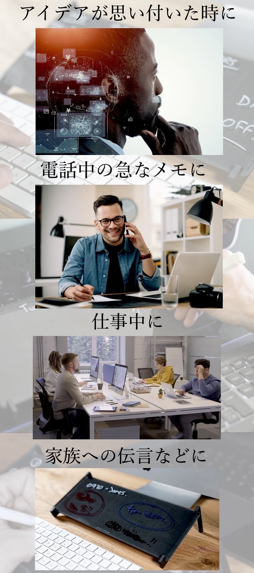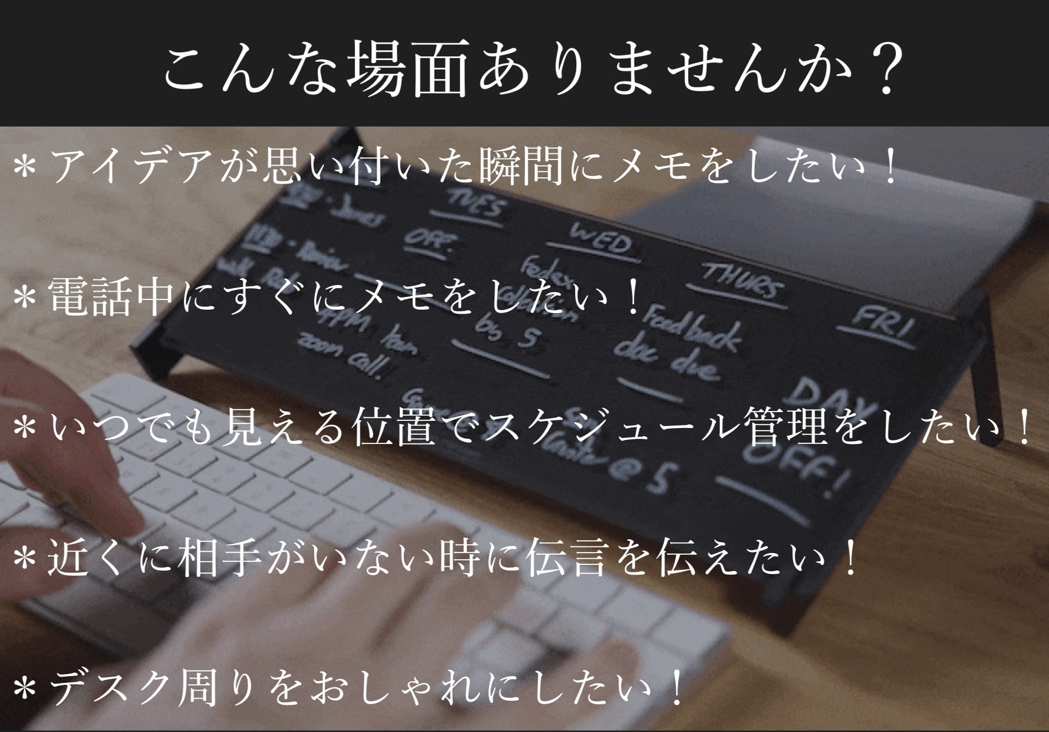 仕事中に瞬時にメモを取ったり、会議や電話の時など、何も忘れないようにするのに最適なボードになります。