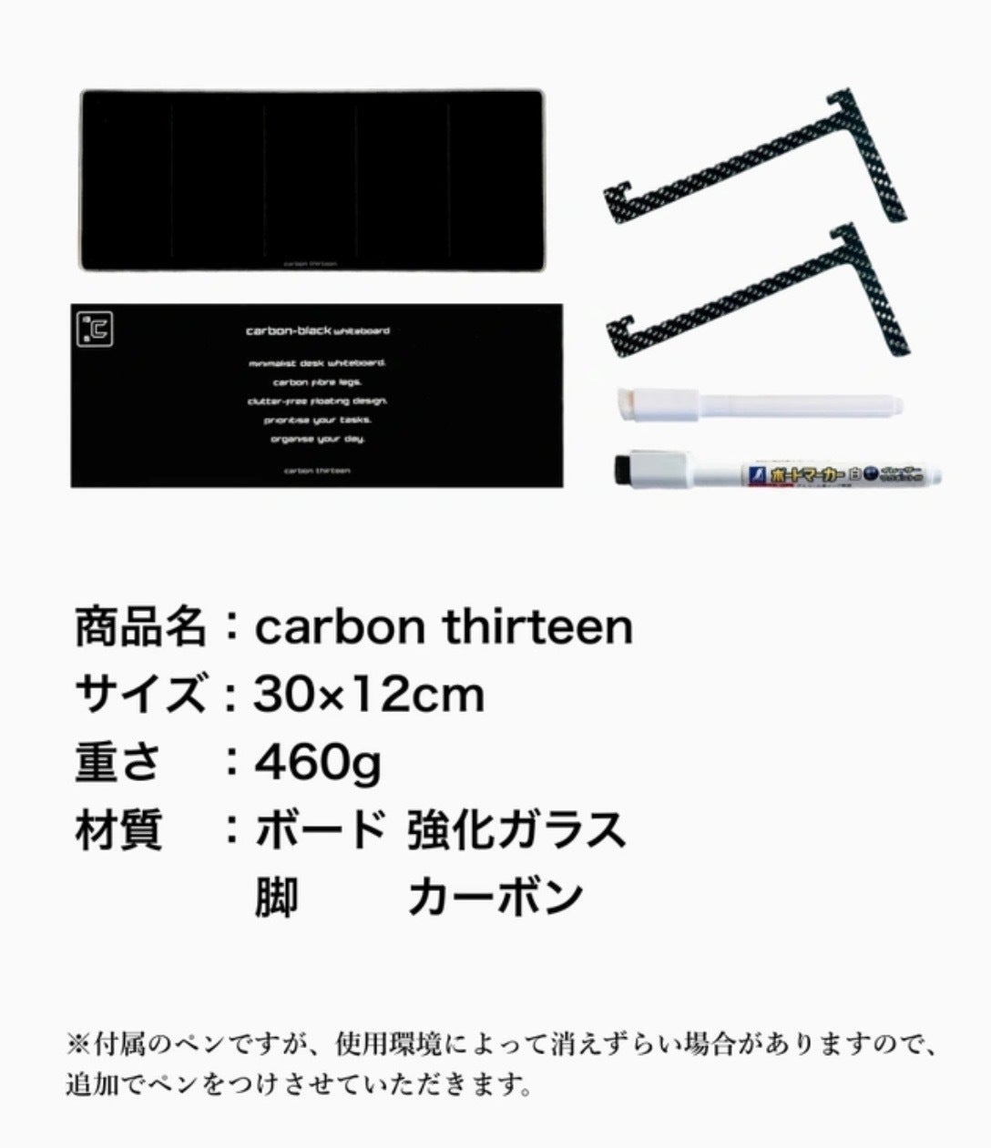 carbon thirteenボードはこれらの問題を解決し、デスク周りをスッキリさせることができます。付属のペンもボードに掛けてすぐにメモが可能!