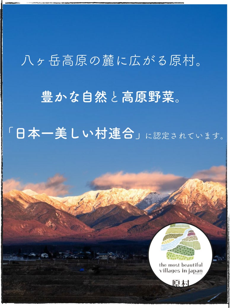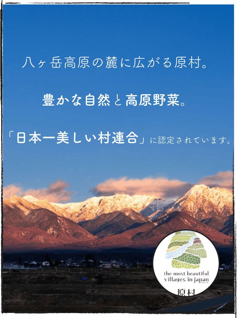 原村は、八ヶ岳の裾野のなだらかな傾斜地に広がる高原の村です。山や谷は少なく、村内からは東に八ヶ岳連峰の雄大な景観を望めるほか、北には蓼科山、北西には北アルプス、西には諏訪湖や入笠山、南には南アルプスや富士山も見渡せる 360 度のパノラマが広がっており、「日本一美しい村連合」にも認定されています。また、数千年を遡る縄文時代の黒曜石鉱山があり、「星降る中部高地の縄文世界」として文化庁の日本文化遺産に指定されています。