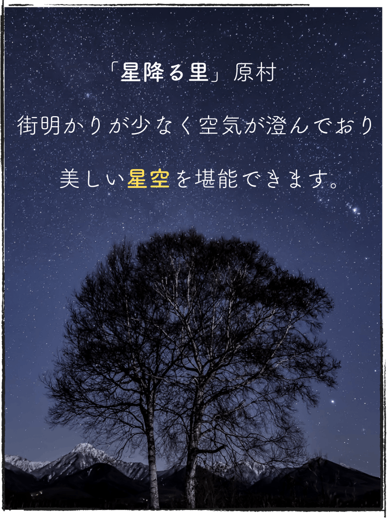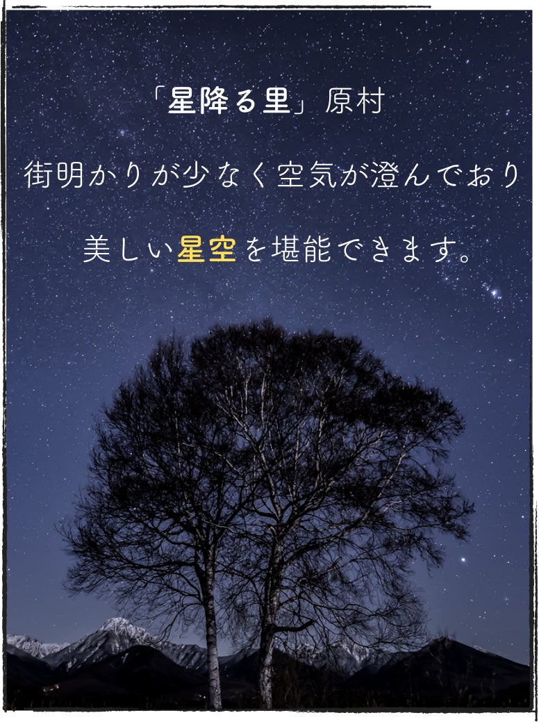 昼夜の気温差が大きく晴天率が高いことや、900-1300mに及ぶ標高、湿度が低いなどの恵まれた環境から、夜には美しい星空が立ちならび、縄文から続く星降る里の姿が現れます。