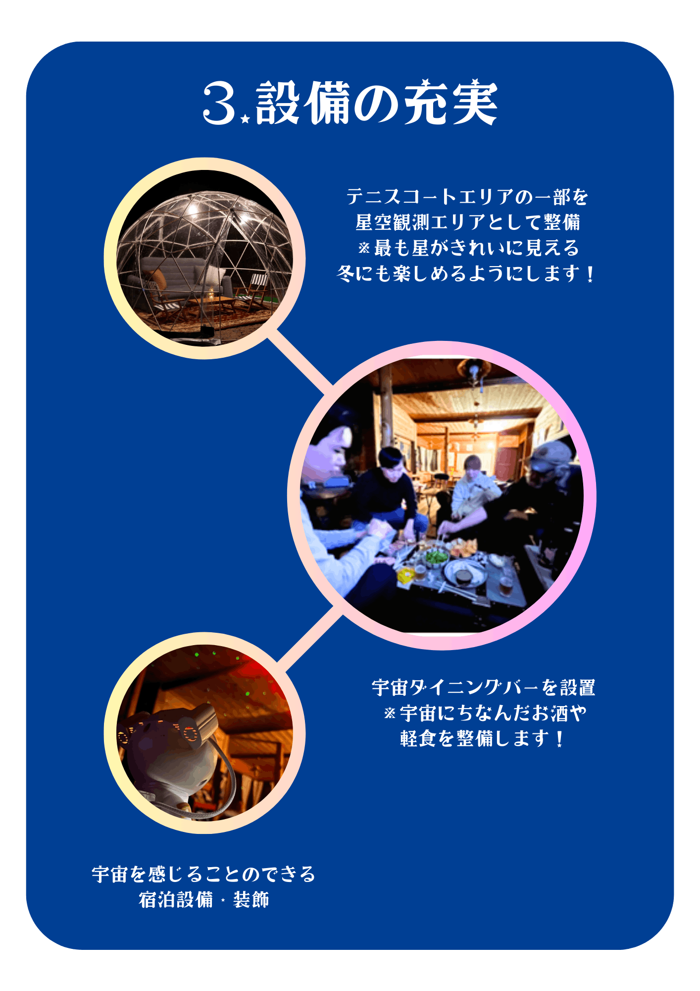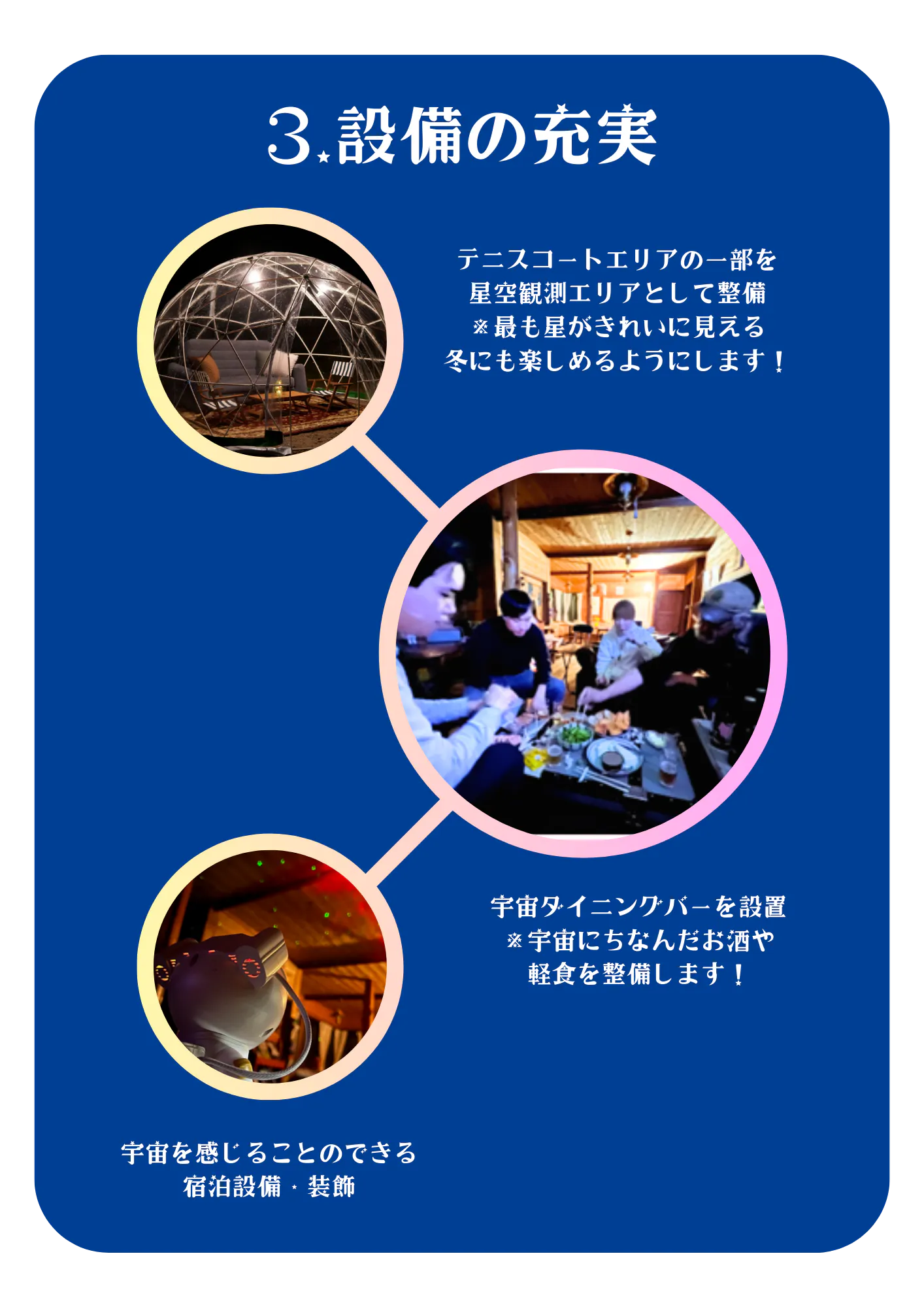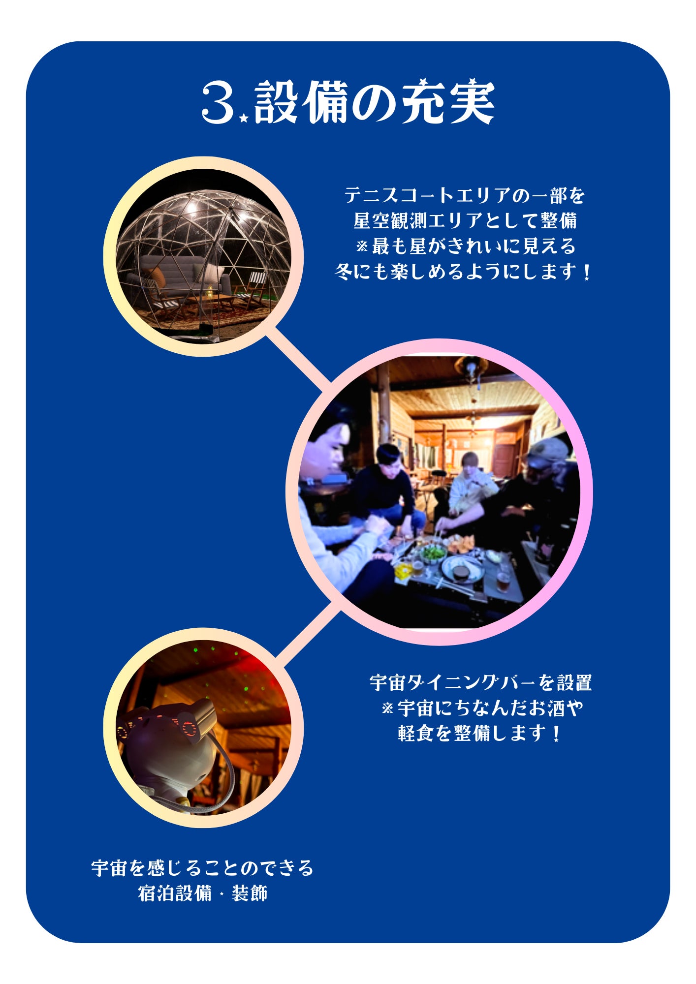 現在は、旧来のペンションに宇宙モチーフの小物や照明がある程度の小さな宇宙装飾がある程度です。これから2027年を目標に、宇宙をテーマとした「体験、食、建築、交流」のコンテンツを段階的に造成し、近未来の宇宙を感じ取っていただけるような場所にしていきたいと考えています。