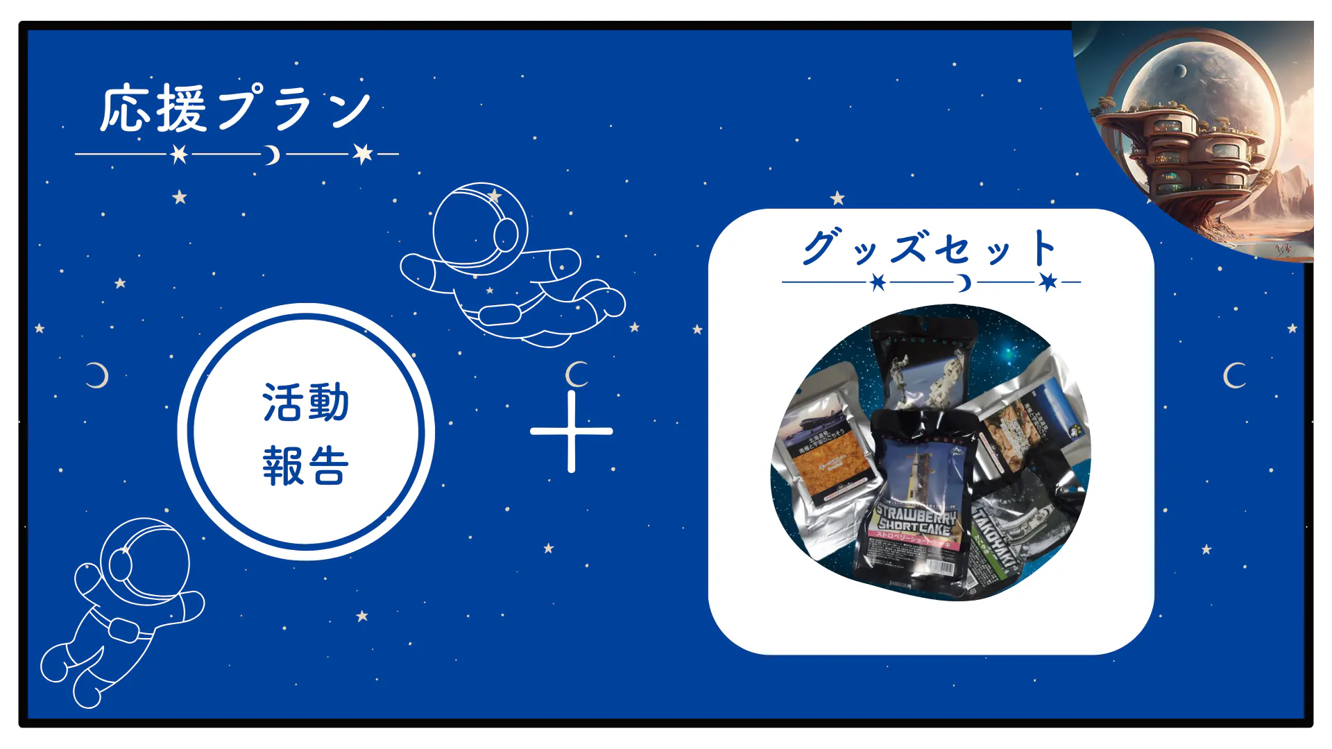 活動報告書に加えて、グッズセット(宇宙食・高原野菜の詰め合わせ)をお送りいたします!