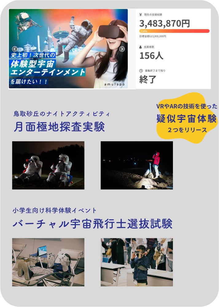 今回、宇宙体験を造成するamulapo(アミュラポ)は、これまでAR/VR等のデジタル技術を用いた宇宙疑似体験のコンテンツを造成してきました。2021年のクラウドファンディングでは、150名以上の方にご支援をいただき、目標金額となる300万円を達成いたしました。おかげさまで、月面極地探査実験A、バーチャル宇宙飛行士選抜試験のサービスリリースを行うことができました!