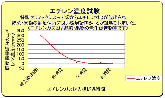 フィルムに混入された他社とは違う弊社オリジナルの特殊セラミックにより、エチレンガスを分解、無害物質にして外に放出します。 鮮度を保持し、商品寿命を格段に延ばします。(エチレンガスとは野菜・果物・生花の呼吸によって出る老化促進物質です) エチレンの分子式はC2H4です 分解するとCO2(炭酸ガス) H2O(水)いずれも無害.物質となります。 |