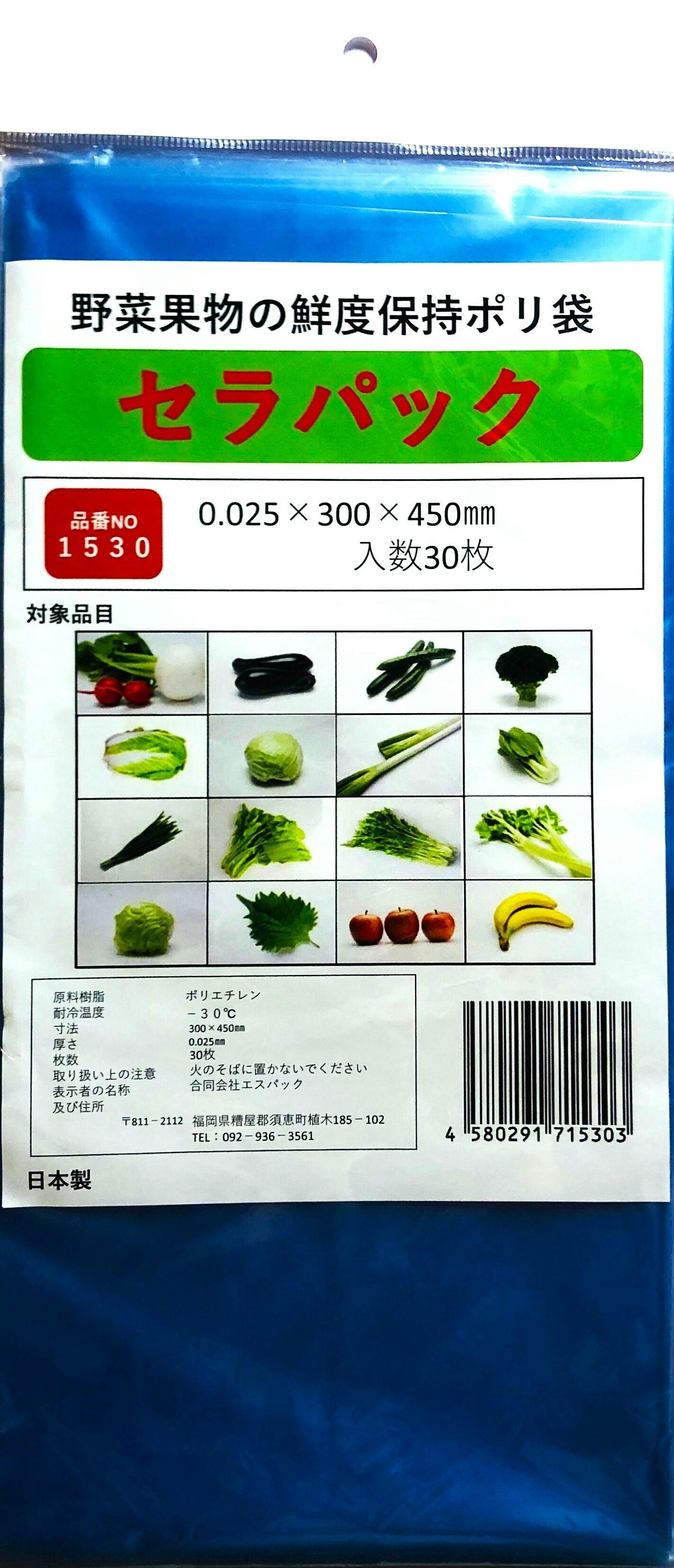 現在鮮度保持袋「セラパック」品番No.1530(厚み0.025 幅300ミリ長さ450ミリ)を最大の割り引きで提供します。レタスがまるまる1個入る大きさです。ご家庭の冷蔵庫の中で、野菜果物の鮮度保持に適しています。