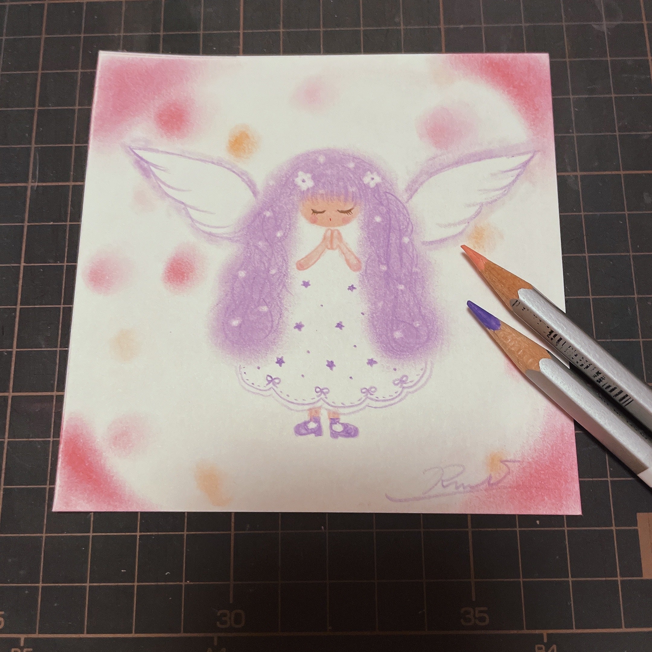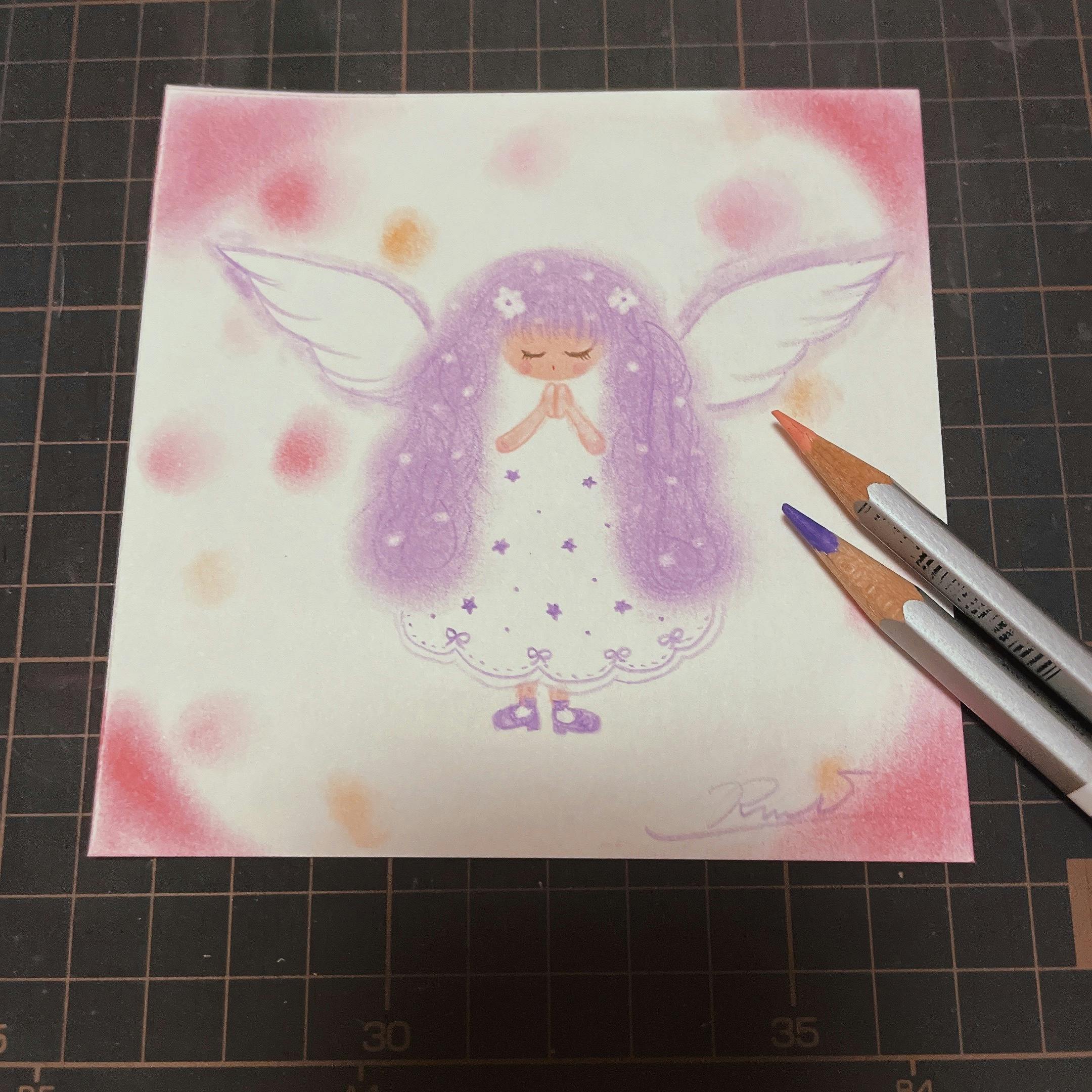 ふと、余った紙で、即興で天使さんだけを描いてみようと思いつき描いてみるとなんだか可愛い子が出来ました。