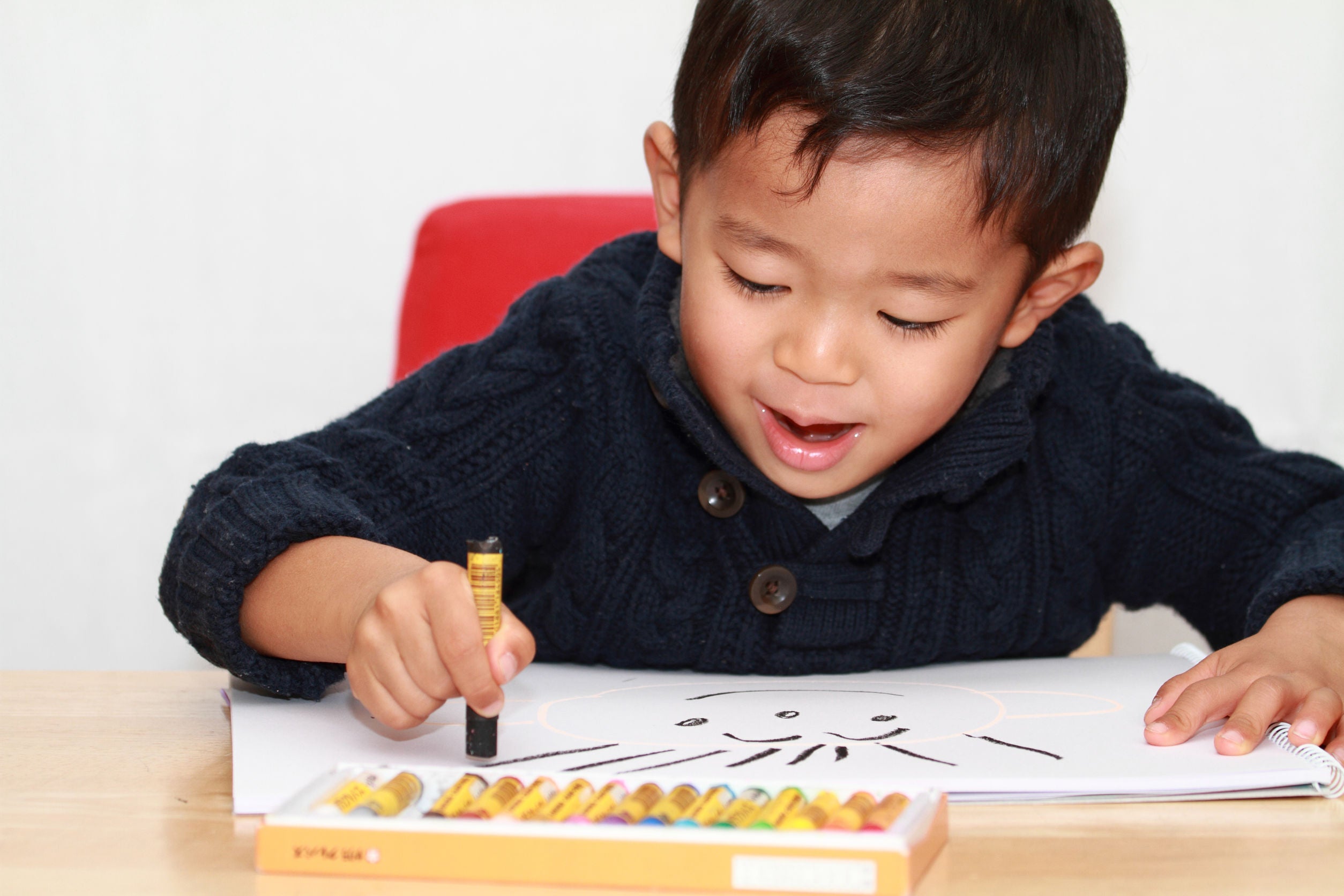 ほと走るような元気な線で描かれたカラフルな絵。私たちは花火かな?と思っていました。ギンくんのママにお電話を差し上げたところ、花火ではなく、それは「おひさま」を描いたものだという事でした。なるほど!普段は直視する事のできない「おひさま」の輝きは、ギンくんの感性を通じてこのように表現されたのです。デザイナーは、このお話を受けて「おひさま作品集!」としてリトルアーティストをお仕立てしました。ギンくんの感性から生まれた「おひさま」は今もまぶしい輝きを放っています。