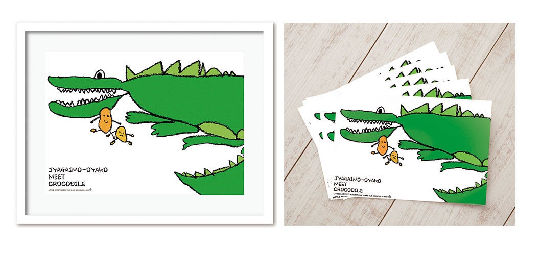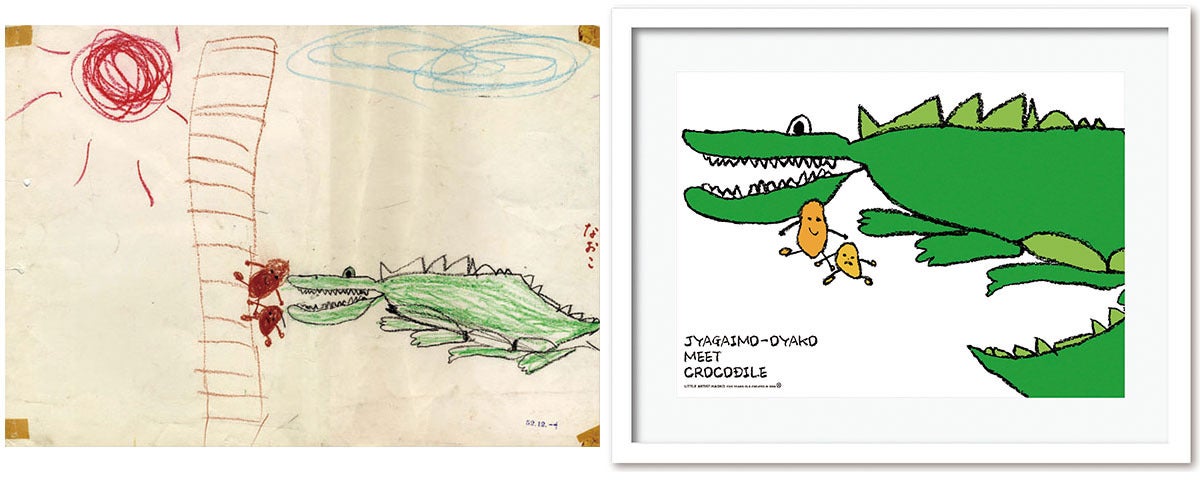 お子さまの豊かな想像力によって描かれた絵です。ひなたぼっこする「ワニ」と、なぜかはしごを登っていく「ジャガイモの親子」。ご家族と相談をしてこの「ワニ」と「ジャガイモ」にフォーカスをあてた作品をお仕立てしました。レイアウトでは、ワニとジャガイモくんが仲良く過ごしているように配置し、ワニのしっぽは途中でカットし反転させる事で、その大きさを表現しました。リトルアーティストの代表作ともいえる作品です。