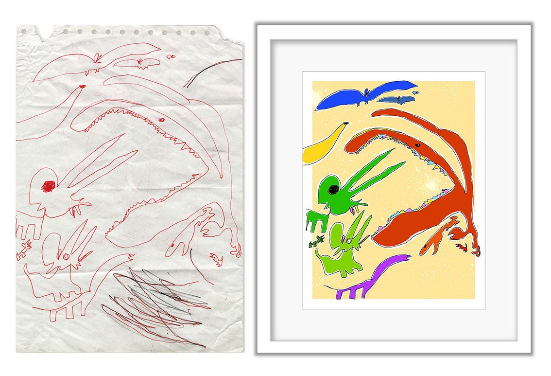 子どもが描いた絵に、プロのデザイナーがコラボレーションして、新しいアート作品を生み出すというサービスです。