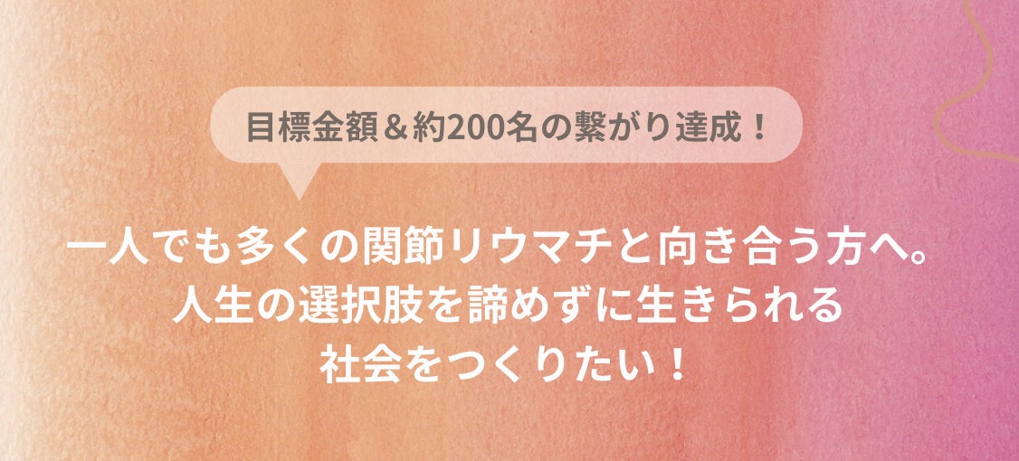 おかげで、たくさんの仲間に出会うことができ、私が「みんなの役に立ちたい」と思っていた以上に、自分もパワーや勇気を与えてもらえることに気が付きました。今回のプロジェクトを通して、「関節リウマチを理由に人生を諦めなくて良い社会」を本気でつくりたいと思っています!