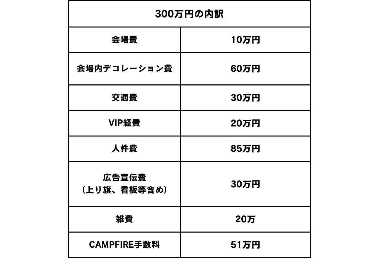 今年は、規模を大きくして行おうと考えているため、人件費(モデルへの支払い、ボランティアの皆様への支払い)等を含めると300万の予算が必要です。