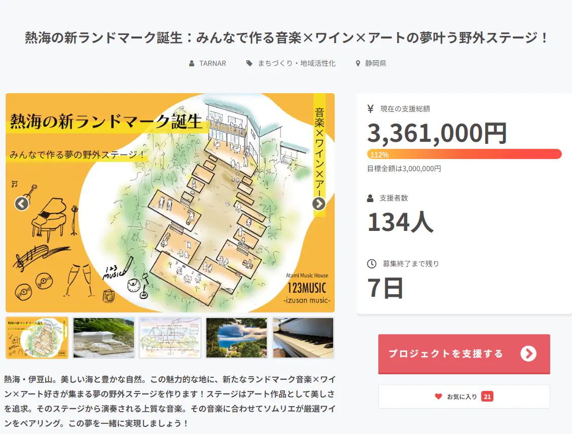 「熱海の新ランドマーク誕生:みんなで作る音楽×ワイン×アートの夢叶う野外ステージ!」プロジェクトオーナーのたーなーです。