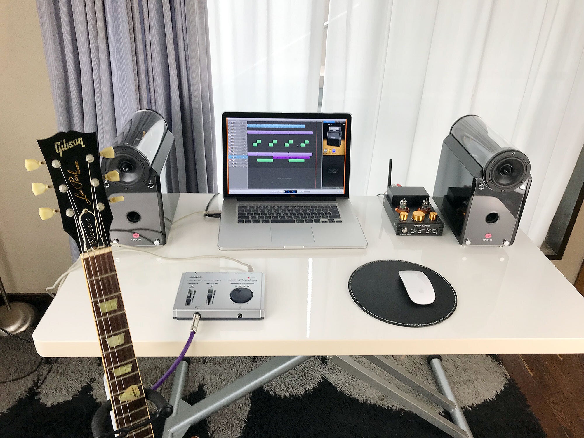 私が使っているのは友人から貰ったKORG USB AUDIO Interface UA-3というモデルです。セッティングは、UA-3をUSBでMac Book Proに接続したらギターのプラグをUA-3に差し込むだけでOKです。GrageBandを立ち上げるとUA-3が自動認識されます。自動認識のままだとに音が出ませんのでGarageBandの設定から出力を自動認識された状態のUA-3から内臓オーディオに変更してあげる必要があります。たぶん、するとイヤホン端子からデジタルミニアンプに音が出力されるようになるのでBOWDOCK BLACKから音が出るようになります。