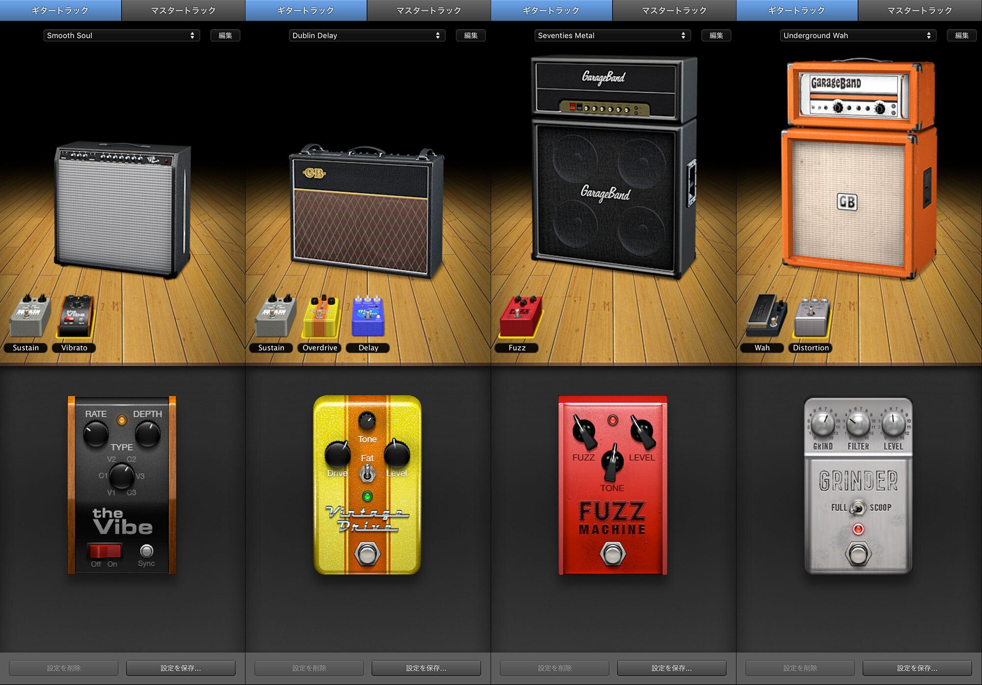 GarageBandにはギター用のアンプシュミレーターというギターエフェクターとアンプを組み合わせたセットがいくつも用意されていています。