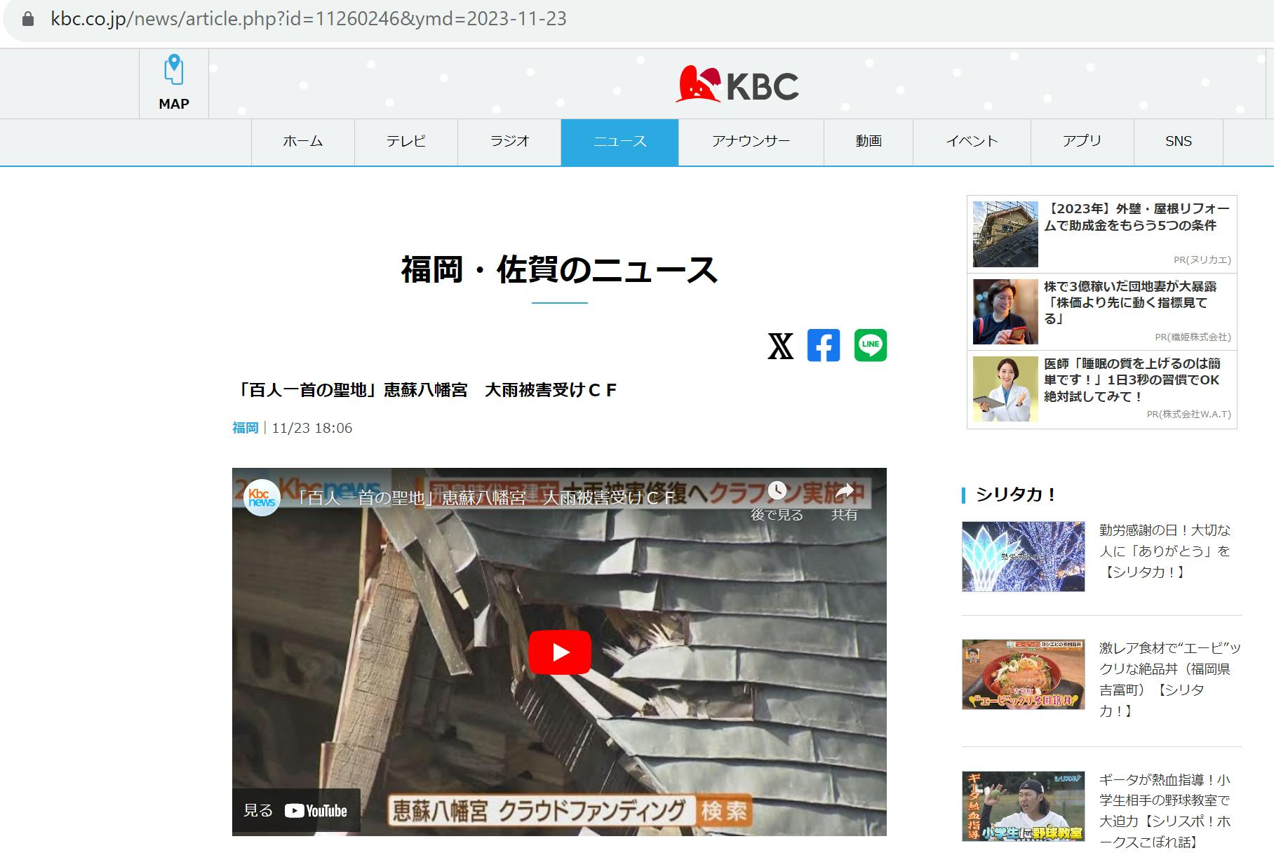 2023/11/24 08:5411月23日KBCさんのシリタカ・アサデスのニュース枠にてこの恵蘇八幡宮のクラウドファンディング取り上げていただきましたKBCでのニュースhttps://youtu.be/F9OiOYjyNoQ?si=IpsPl6Xc7bPzNavwクラウドファンディング終了まで後一週間をきっておりますが、大変ありがたいお力添え本当にありがとうございます! もっと見る