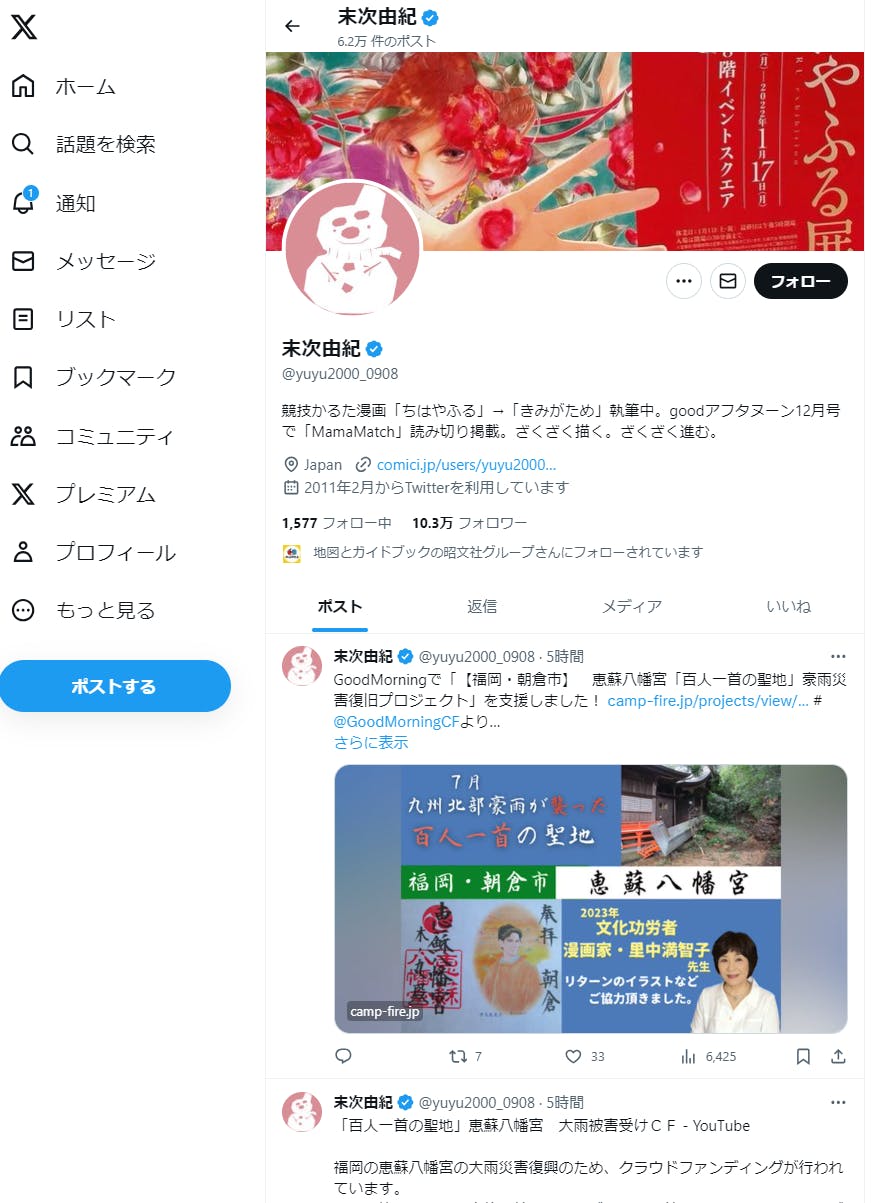また、映画でも絶大な人気を誇る競技かるたに青春を燃やす高校生たちの人気マンガの作者:末次由紀先生が旧Twitter(X)でこのプロジェクトを紹介して下さいました。