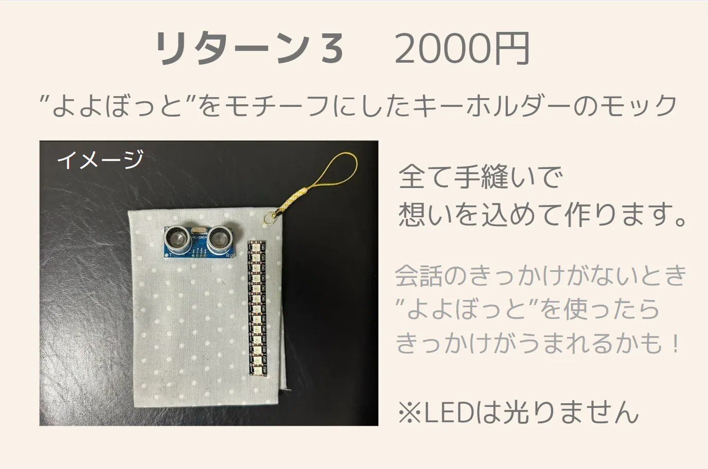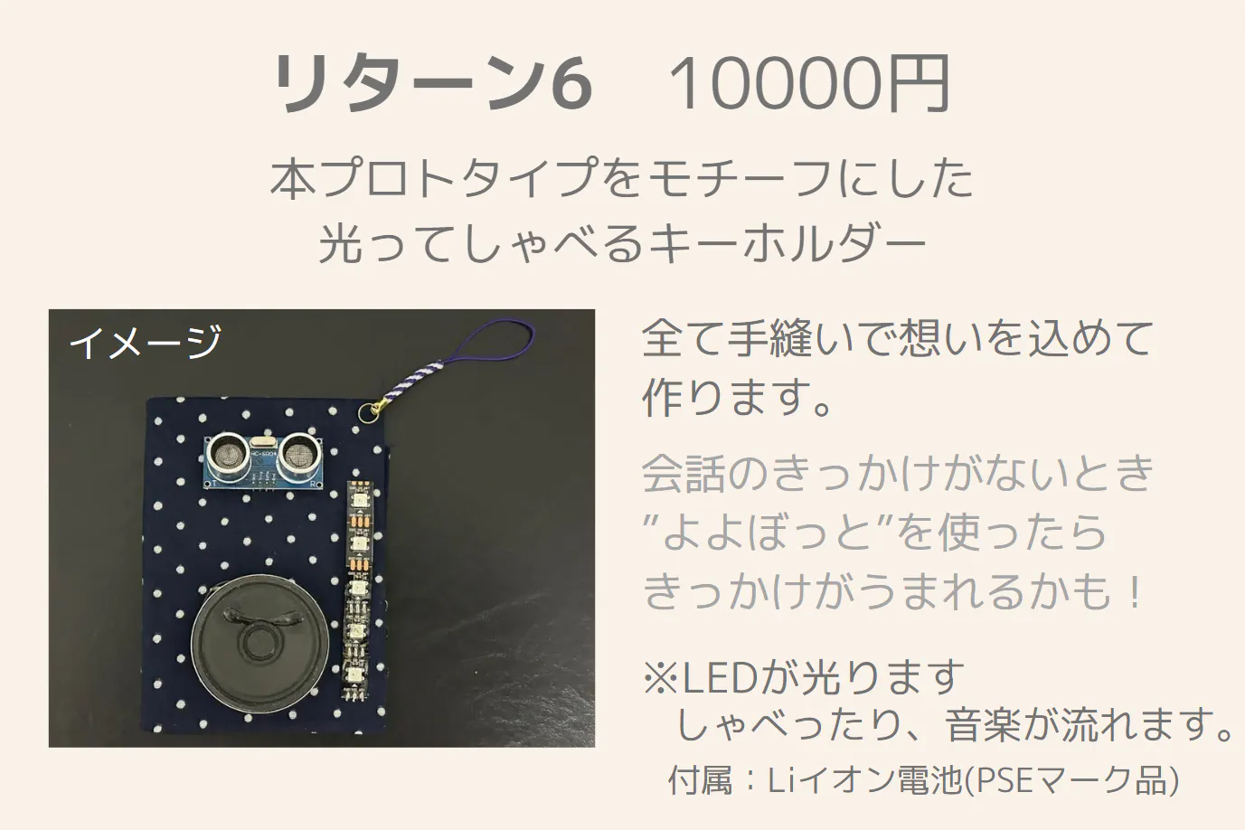 2023/11/29 23:40支援者の皆さま想いを伝える勇気を!会話のきっかけを作ってくれる「よよぼっと」への温かいご支援、本当にありがとうございました。クラファン募集終了から、大体2か月弱経ちました。その間、よよぼっとを連れて様々な場所を旅したり、電子工作のオフラインイベントに参加したり、心拍機能の実装を進めたり、リターン準備したり...。本当、あっという間の2か月だったように思います。この2か月を振り返るとともにそのあたりのことを記事にまとめましたので共有させて頂くとともに、改めてお礼のメッセージとさせていただきたくよろしくお願い致します!note記事電子工作を通して広がるつながり!クラファン終了後の2か月よよぼっとのリターンの制作風景(チラ見せ) リターンも手縫いで作ってます!皆さま、本当に有難うございます!引き続きよろしくお願いいたします。 もっと見る