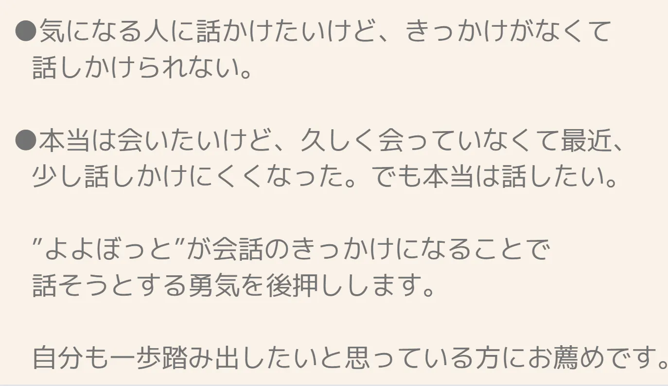 7年会えていなかった友人。会っていない期間が長くなれば長くなるほどいつの間にか、話かけれなくなっていました。でも、話したいって気持ちはずっと持ってました!”よよぼっと”が出来たこのタイミングで話さなかったら、もう二度と話せない気がする。思い切って話してみました!自分だけがいつの間にか見えない心の壁を築いてしまっていたことに気づきました。