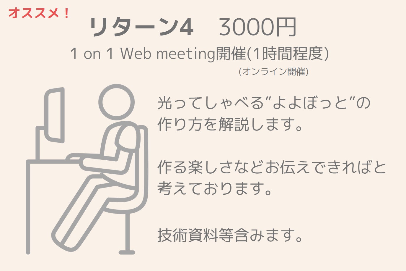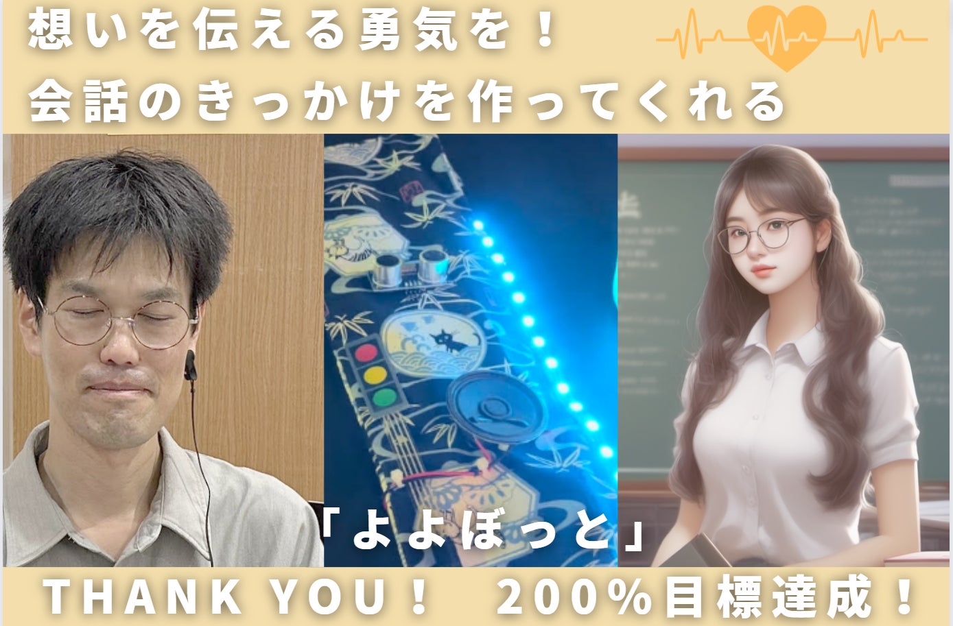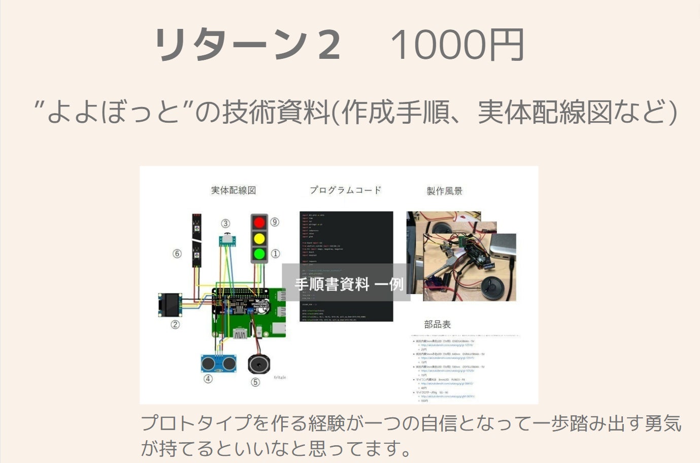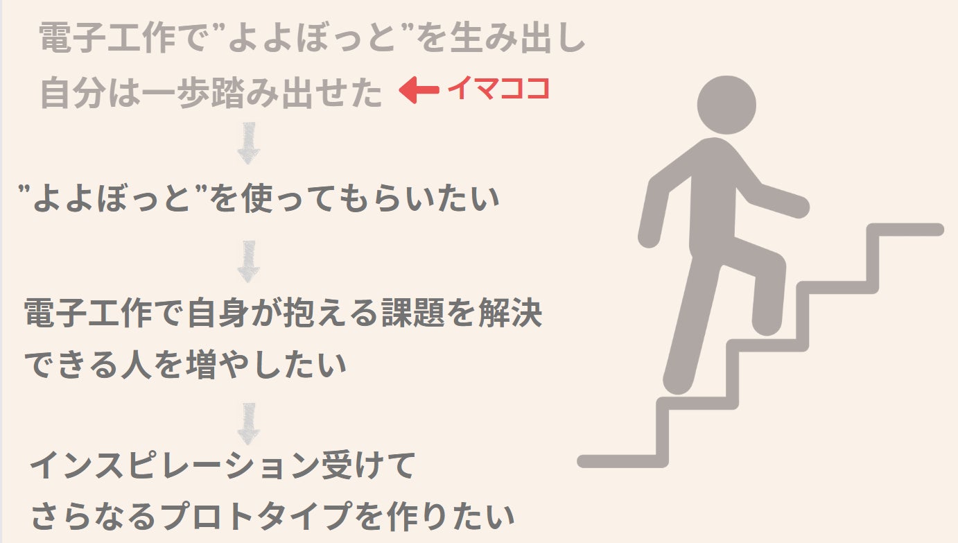 電子工作で”よよぼっと”を生み出したことで、私は一歩踏み出すことが出来ました。次のステップとして、”よよぼっと”を使って頂くことで、”会話のきっかけがない。勇気が出ない。”など私と同じように悩んでいる人達が一歩踏み出せる手助けが出来ればと考えております。さらなるステップとしては、"よよぼっと"の作り方を伝え、実際に作っていただく活動を継続することで電子工作の価値や楽しさを広め、独自の電子工作を通じて自身が抱える悩みが解決出来た!っていう人を増やしたい。将来的には、電子工作で一歩踏み出せた人達の姿をみたり聞いたりして、私も含めた他の人もインスピレーションを受けて、自身の新たな課題を解決するプロトタイプを作り続ける文化を広げていきたい!と考えております。もし、共感頂ける方がおられましたら、ご支援頂きたくよろしくお願い致します。