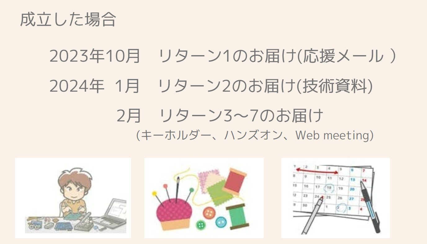 本プロジェクトはAll-or-Nothing方式で実施します。目標金額に満たない場合、計画の実行及びリターンのお届けはございません。