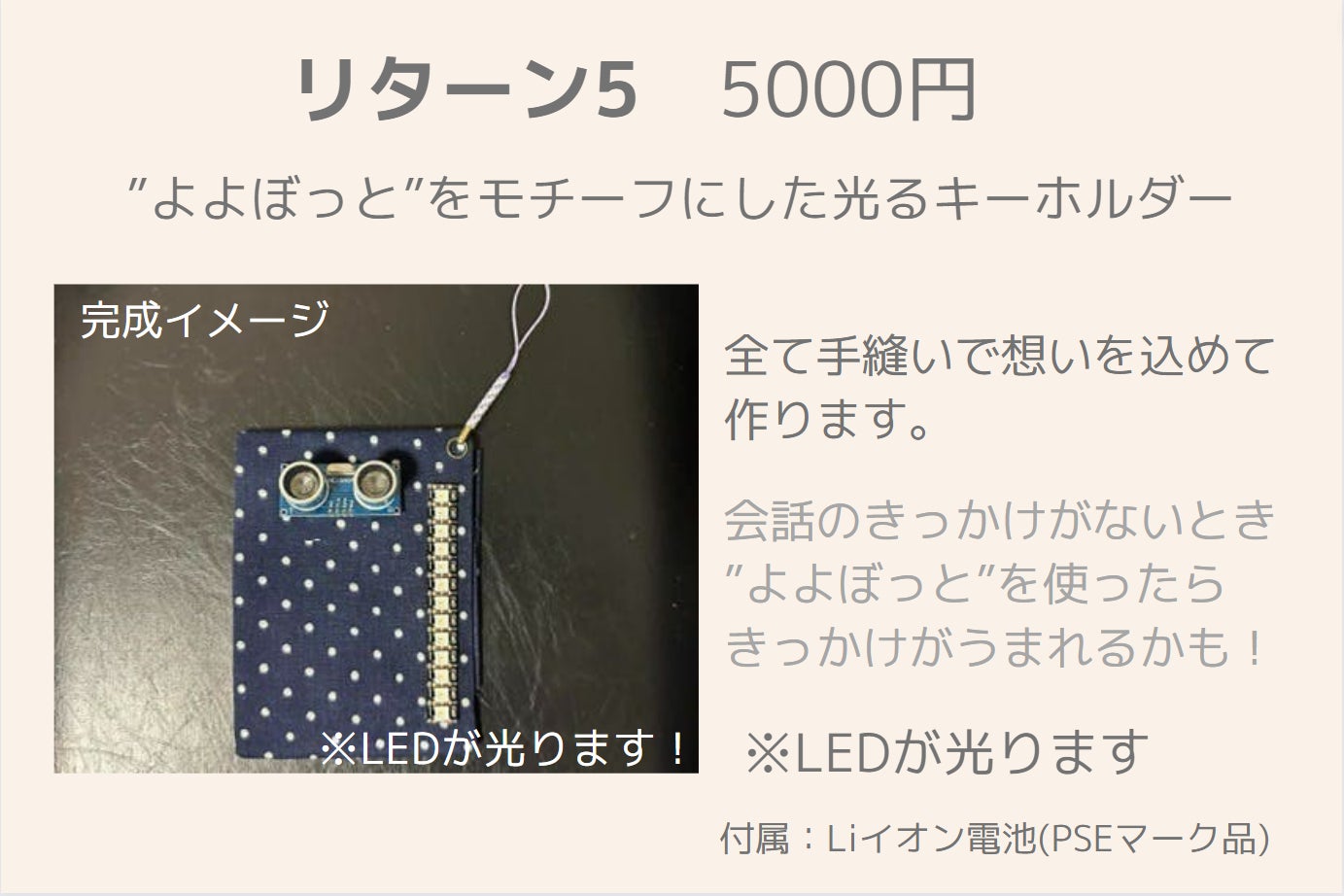 2023/11/29 23:40支援者の皆さま想いを伝える勇気を!会話のきっかけを作ってくれる「よよぼっと」への温かいご支援、本当にありがとうございました。クラファン募集終了から、大体2か月弱経ちました。その間、よよぼっとを連れて様々な場所を旅したり、電子工作のオフラインイベントに参加したり、心拍機能の実装を進めたり、リターン準備したり...。本当、あっという間の2か月だったように思います。この2か月を振り返るとともにそのあたりのことを記事にまとめましたので共有させて頂くとともに、改めてお礼のメッセージとさせていただきたくよろしくお願い致します!note記事電子工作を通して広がるつながり!クラファン終了後の2か月よよぼっとのリターンの制作風景(チラ見せ) リターンも手縫いで作ってます!皆さま、本当に有難うございます!引き続きよろしくお願いいたします。 もっと見る