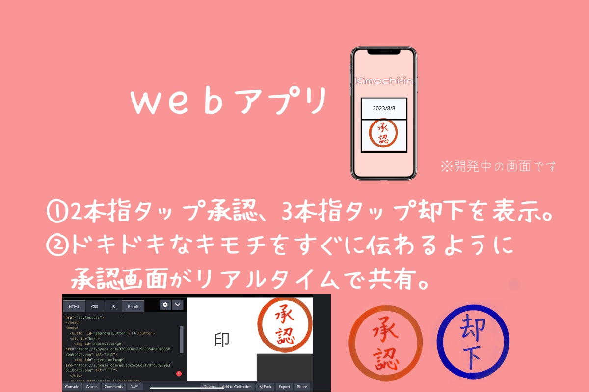 『Kimochi-in』は専用WEBアプリと専用ハンコを使って楽しく申請→承認をする仕組みです。