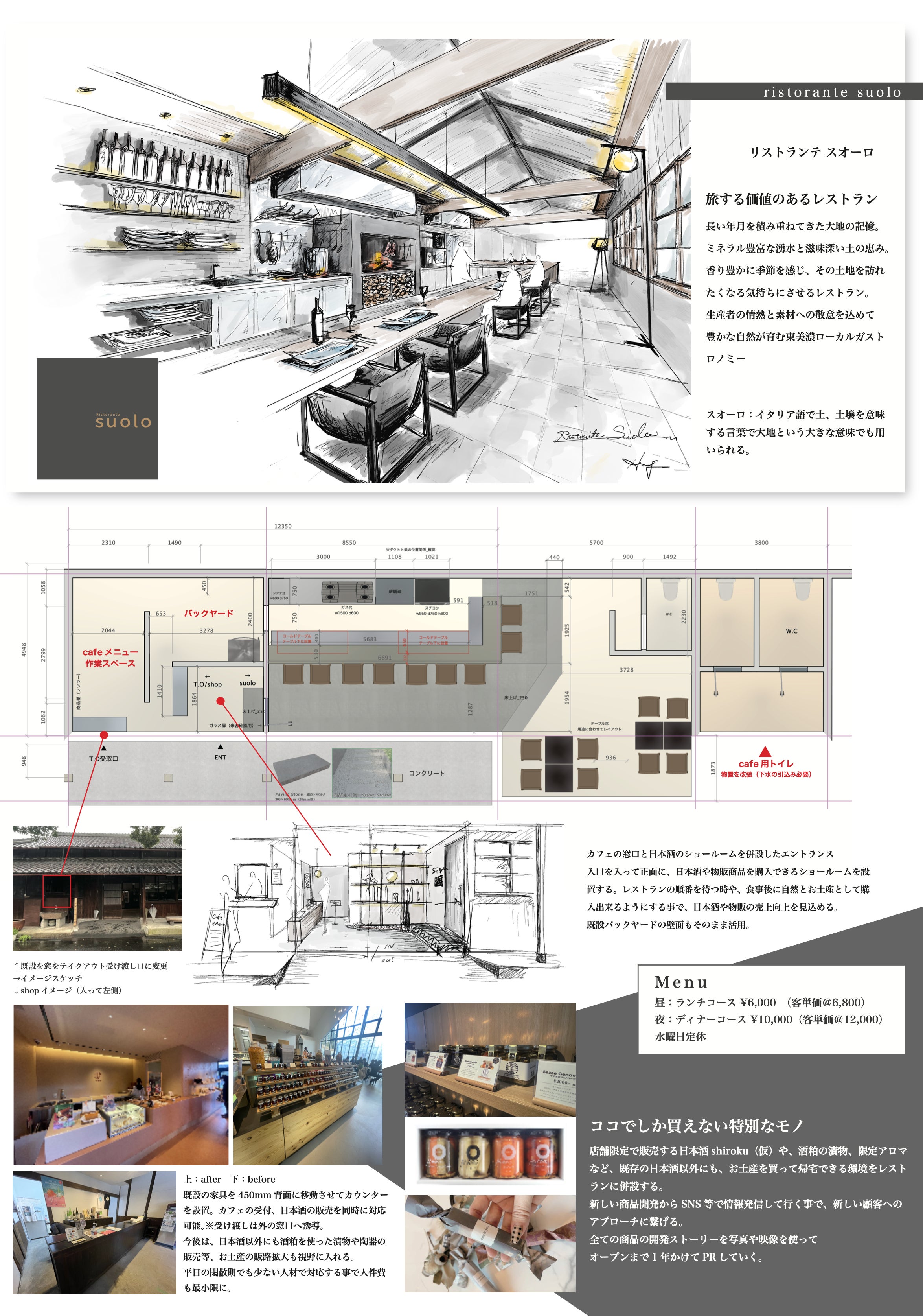 suolo(スオーロ) : イタリア語で”土や土壌”を意味します。酒蔵の土地や瑞浪の歴史という土壌を舞台に新しい価値を産み出す為に命名にしました。訪れる事が価値になる、豊かな自然が生み出す良質な食材を五感で楽しむイタリア料理店。