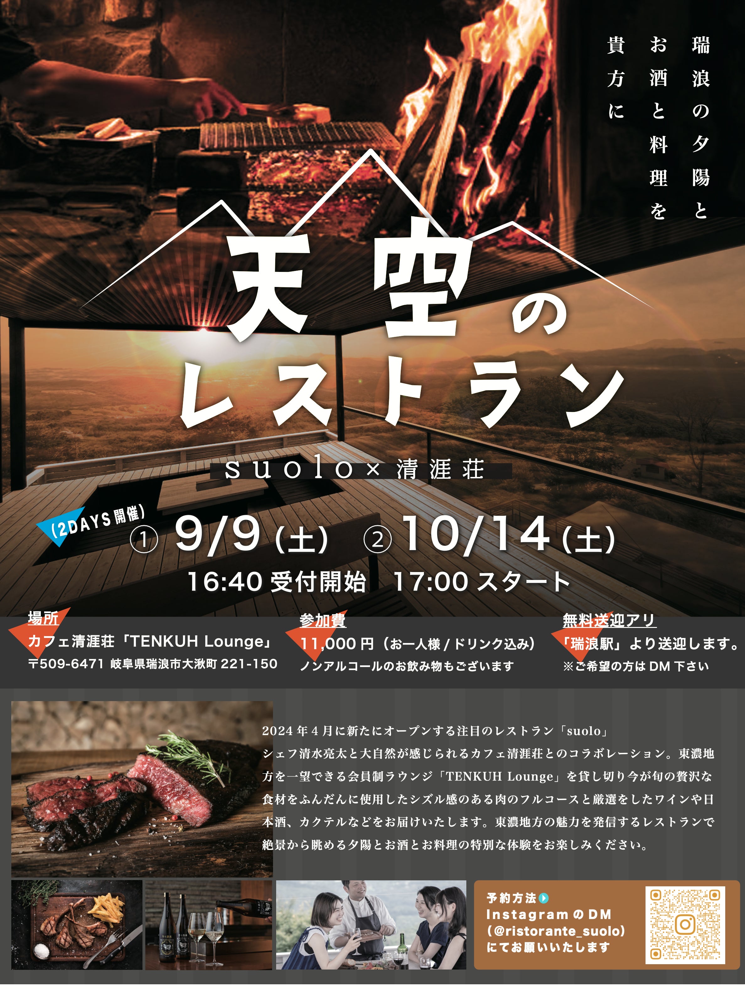 東濃地方を見渡せる絶景ロケーションの夕焼けをバックに、ペアリングしたイタリアンコースを皆様に楽しんで頂きました。