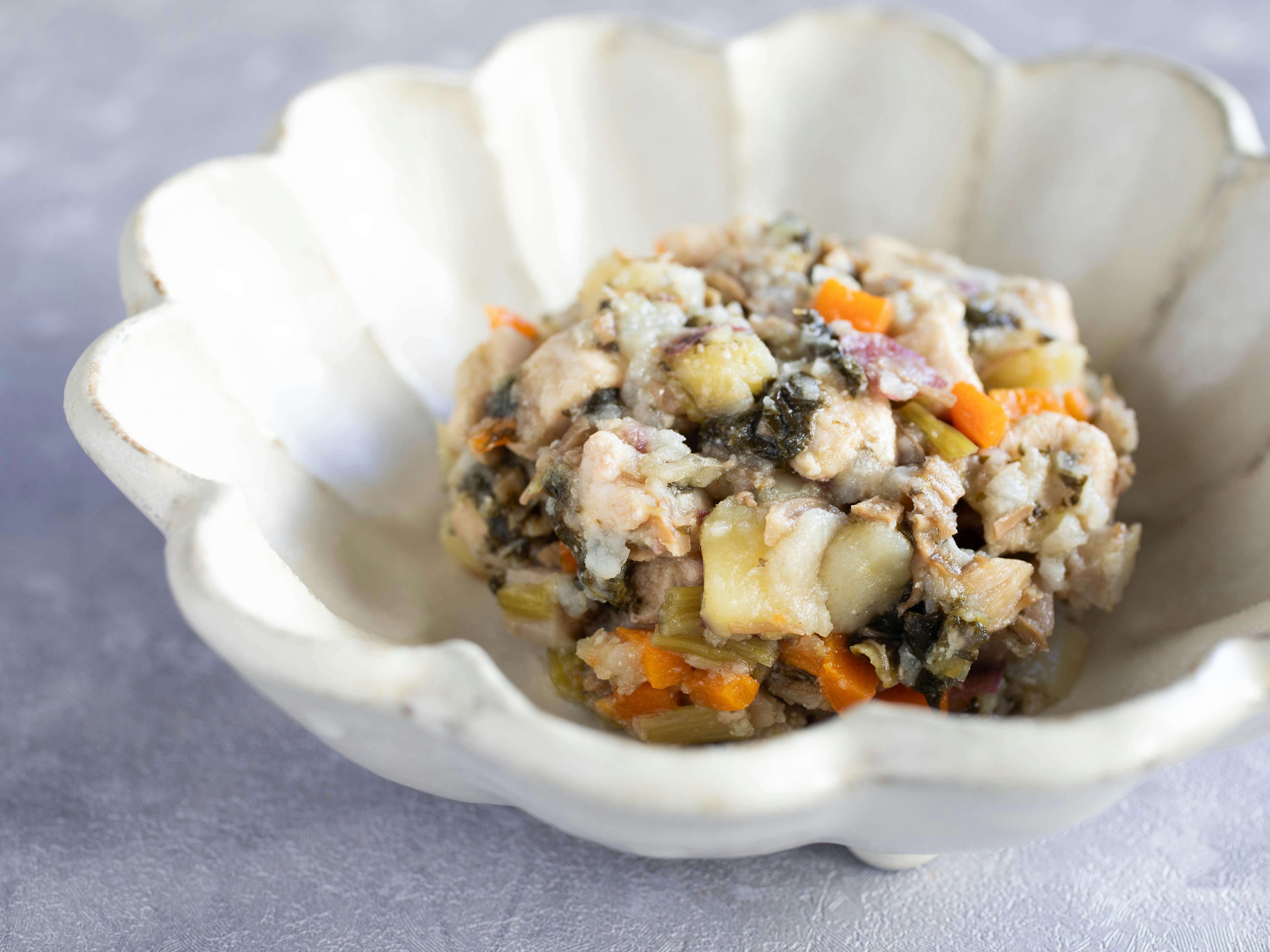 原材料:鶏肉(鶏むね肉・ブロッコリー・かぼちゃ・大根・白飯・豆腐・人参・乾燥舞茸・黒ごま・乾燥わかめ)