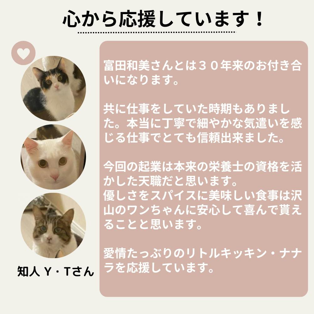 私は一般社団法人日本アニマルウェルネス協会認定のペットフーディストで、愛犬のための手作りごはんを提供するLittle Kitchen Nanalaを運営している富田 和美と申します。