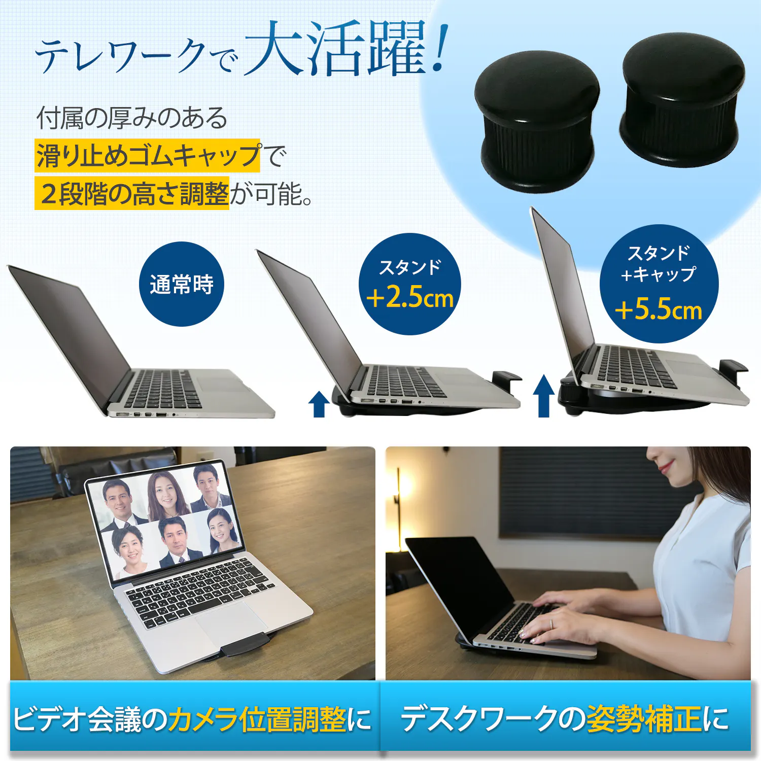 ノートパソコン移動スタンド Pacollon(パコロン) は180グラムとスマホ並みに軽く、2つ折りすればA4サイズにすっぽり収まるので、ノートパソコンと一緒に商談や会議の席に持ち運べます。パソコン画面をサッと回転させて相手に見せることができるので、会議や商談でのプレゼンの時間が短縮します。さらに、スタンド上面2ヶ所に取り付けられた滑り止め用クッションゴムに付属のゴムキャップを被せれば、キーボードが傾くことで、操作性が向上します。また、パソコン内蔵のWEBカメラ位置が目の高さまで上がり、カメラ映りが良くなります。