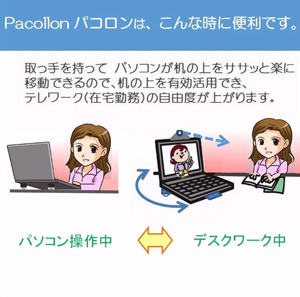 職場や家庭でパソコンと向かい合う時間が増える中、両手を使ってノートパソコンの位置を調整するのがとても面倒!と感じたことはありませんか。ノートパソコン移動スタンドPacollon(パコロン)ならパソコンを素早く回転させ画面を見せて相談できるので、仕事のロスを防止できます。また、指先で取っ手を持ち上げるだけでパソコンをサッと移動できるので、机の上を広く使え、仕事の効率がアップします。さらに、リモート会議や顔認証では、ノートパソコンのWEBカメラ位置を指先で楽に調整できるので、ZOOMなどリモート会議の準備時間が短縮できます。「パソコン操作を少しでも楽に!」がノートパソコン移動スタンドPacollon(パコロン)のモットーです。