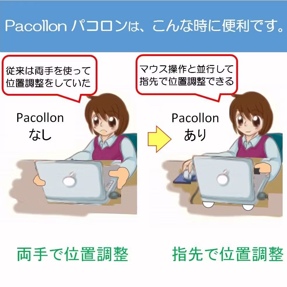 例えば皆さん、パソコンで作業中にパソコンを動かそうと思ったら、両手で持ち上げなければいけないかと思うんです。こちらの“パコロン”があれば、持ち上げることが不要になります。この本体裏側の白い部分にボールベアリングが搭載されているので、本体の上にパソコンを置いてあげて、取っ手(“パコロン”と書いてあるシールの部分)をちょっと持ち上げるだけで、簡単にスルスルスルとパソコンを机の上で動かすことができます。マウス操作と並行して指先でパソコンの位置調整ができるという意味で、仕事の効率がアップする製品です。