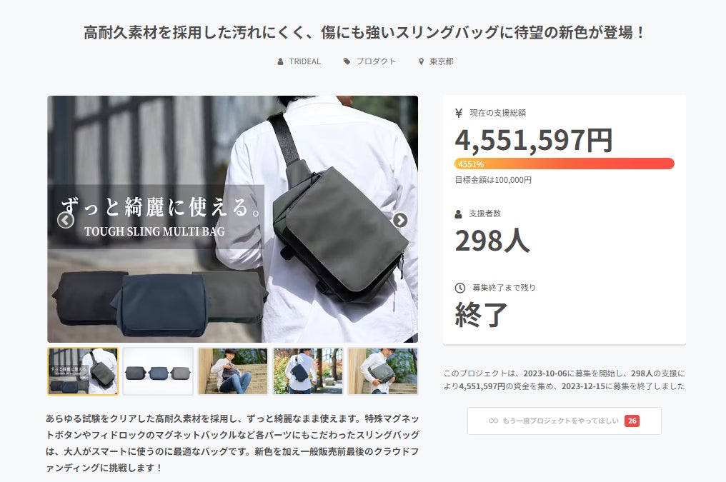 CAMPFIREユーザーの皆様こんばんは!TRIDEAL運営チームです。とうとうプロジェクトもラスト2時間になりました。タフスリングマルチバッグのプロジェクトは本日の23:59までになります!本当に沢山の方にご支援頂きましてありがとうございます。リターンはプロジェクト終了後すぐに配送の手配を掛け、12/19~21までに全ての発送が完了する予定なので、すぐにお手元に届きます!累計1800万円以上売れている大人気プロダクトの最後のクラウドファンディングになりますので、ご検討中の皆様は、ご支援し忘れにご注意ください。それでは最後まで宜しくお願い致します!TRIDEAL運営チーム毎回プロジェクト終了後に、「支援し忘れたのでクラファン価格で売って欲しい」という声を頂くのでご検討中の方に通知が届くように活動報告を更新しております。既にご支援を頂いている方にも通知が沢山届いてしまうことご容赦ください。