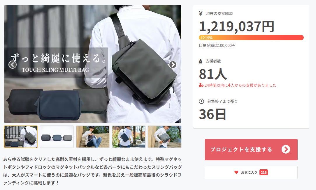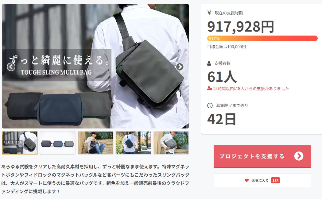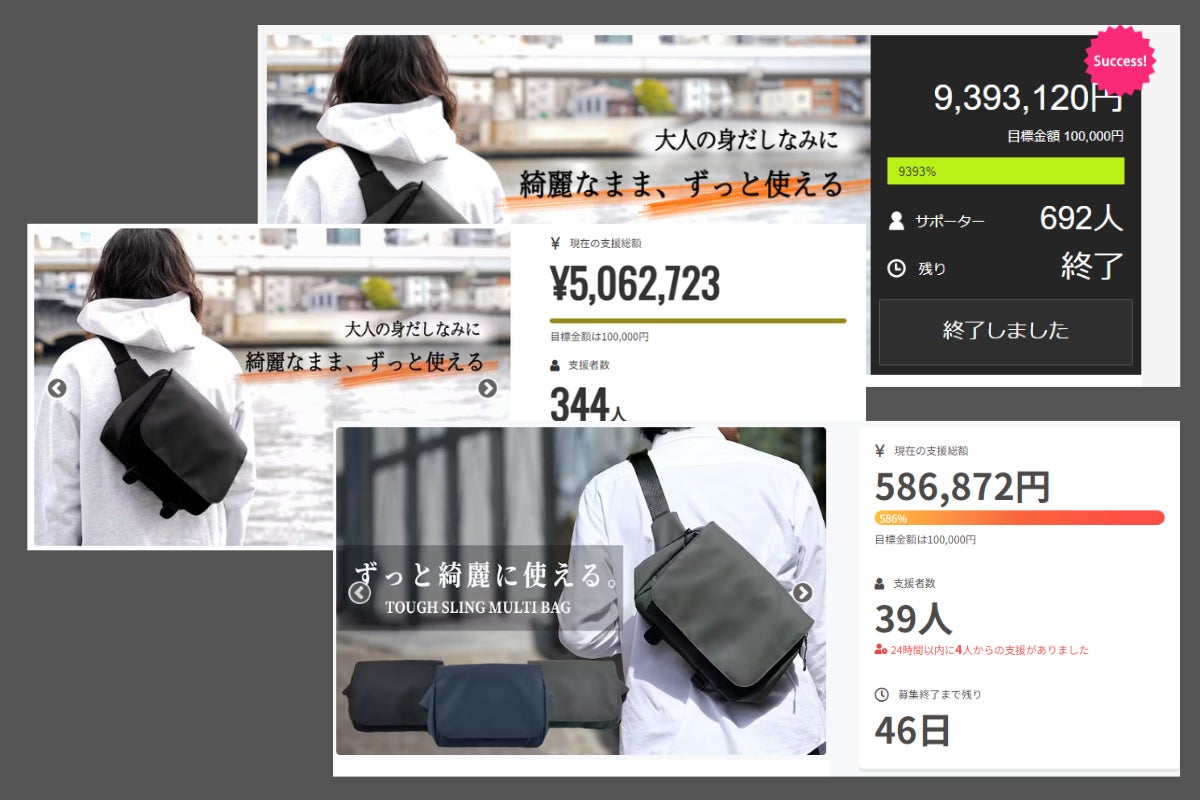 CAMPFIREユーザーの皆様こんばんは!TRIDEAL運営チームです。現在CAMPFIREでプロジェクトを実施中のタフスリングマルチですが、本日累計支援総額1500万円を達成しました!Makuakeで692名の方から9,393,120円machi-yaで344名の方から5,062,723円CAMPFIREで39名の方から586,872円合計1075名の方から15,042,715円を応援、ご支援して頂きました。本当に沢山の皆様ありがとうございます。もちろんまだまだ最後までもっと上を目指して頑張りますので、CAMPFIREのプロジェクトでも沢山の方からのご支援をお待ちしております。CAMPFIRE終了後は、自社ECやamazon等ECモールで、一般販売予定価格通り19,800円で販売をする予定ですので、ご検討中の方は是非CAMPFIREのプロジェクトでお得にGetして下さい!明日からも気を引き締めて頑張りますので、引き続き応援、ご支援宜しくお願い致します。TRIDEAL運営チーム
