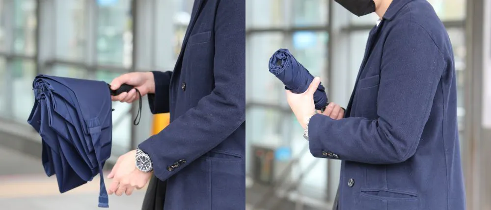 今回、最大のアップデートは周りが濡れにくい『逆折り仕様』になったことです。従来の折り畳み傘は,雨で濡れた面が折り畳んだ時に、外側に来るのに対し、ROLLS REVERSE(ロールスリバース)は濡れた面が内側に来るように設計されています。
