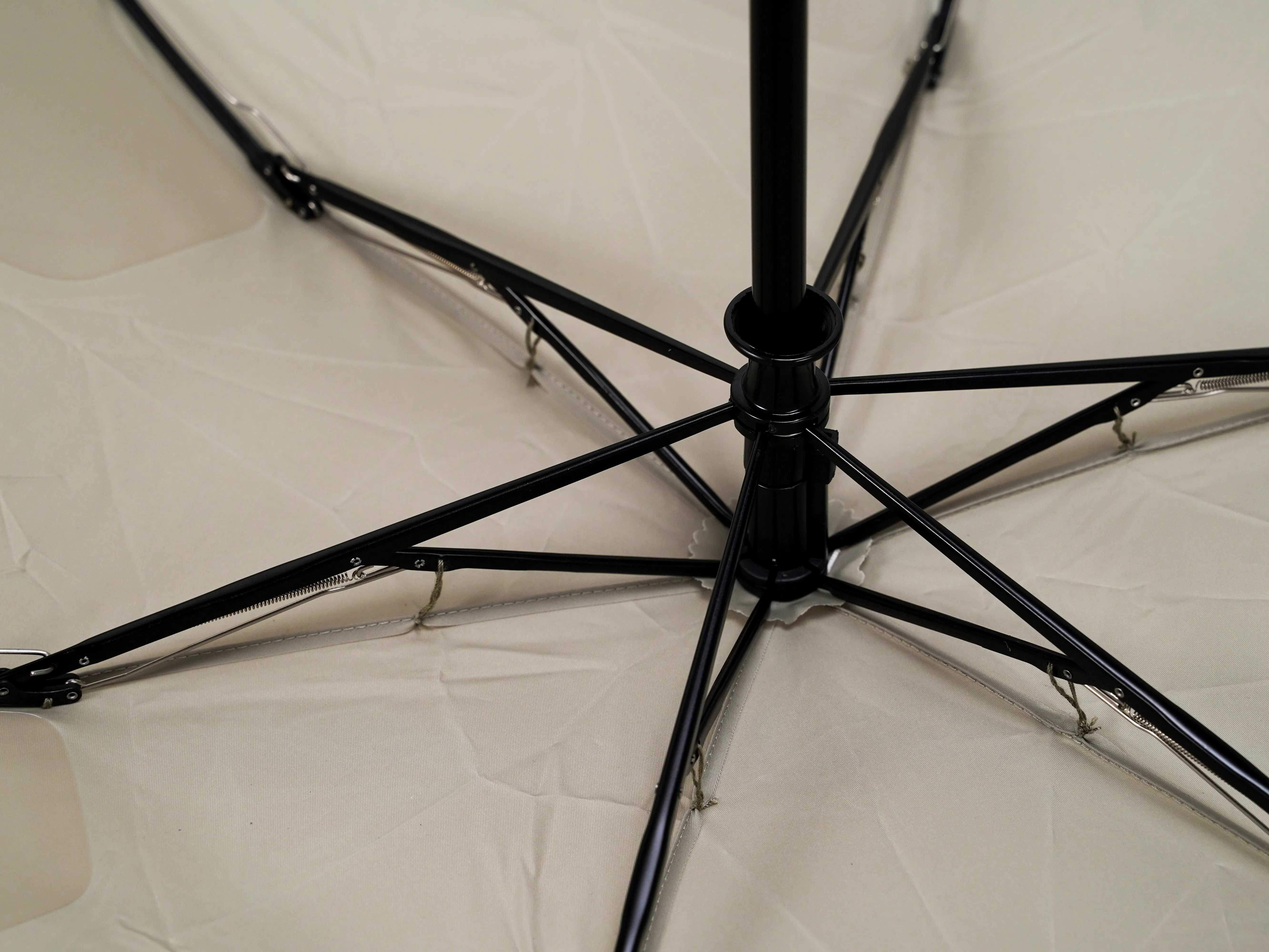 どんなに急いで畳んでも「美しい折り目」をキープできる秘密は、傘の内側に幾何学的に貼り付けられた、「PET素材」。生地としっかり密着しているので長期間のハードな使用でも剥がれる心配は不要です。