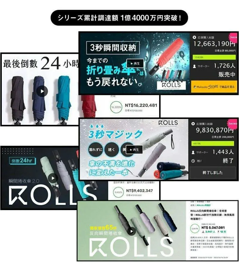 シリーズ累計1.4億円調達した、美しく畳める、3秒瞬間収納傘のROLLSから開発期間2年、試験に1年かけた周りが濡れにくい逆折りタイプのROLLSの最新モデル、ROLLS REVERSE(ロールスリバース)がついに登場!前作から大きく5点改善し、更に使いやすい折り畳み傘として生まれ変わりました!