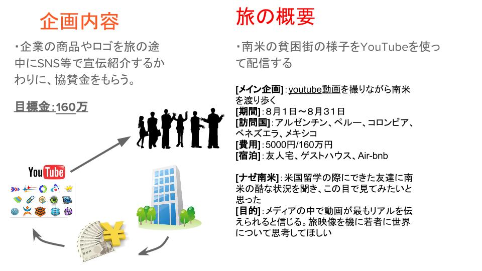 加えて、私はここに理想を語る。南米旅というものを、商取引の形で叶えたい。動画で会社説明や、ロゴを紹介する代わりに、企業や投資家から資金160万を提供していただき、南米の途上国の様子をYoutubeに投稿したい。これを題して【南米協賛紀行録】×Youtuberとする。ナウい。