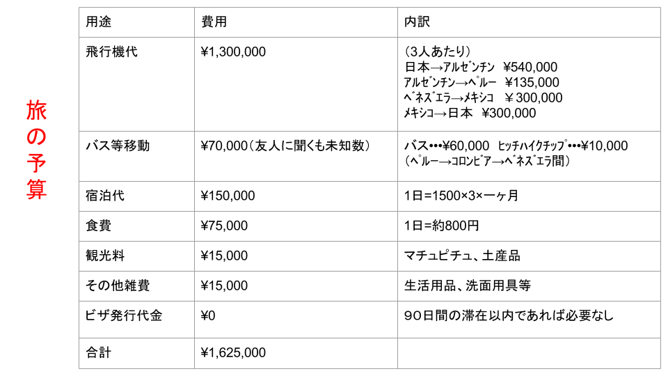 資金の使い道は、ほとんどが旅費です。旅の計画を立ててみたところ、上記のような予算が必要をとなりました。