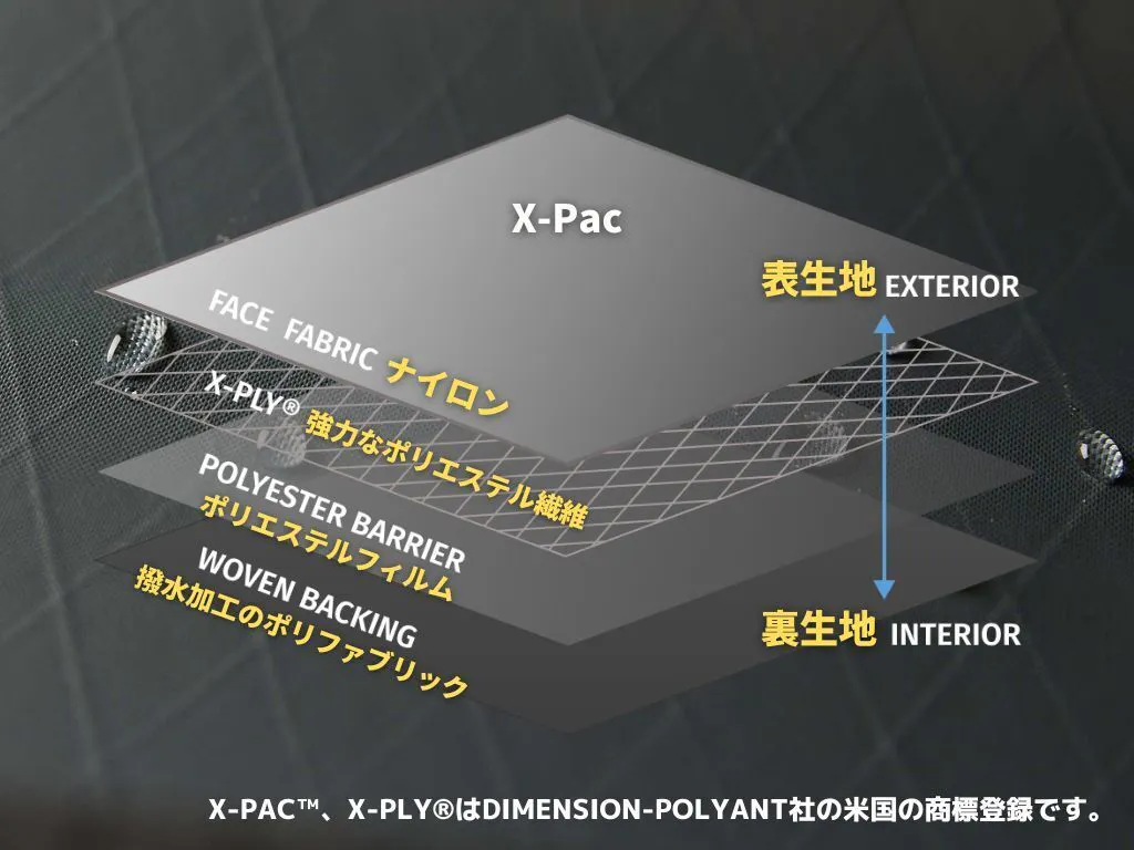 ベースとなる生地は、アウトドア業界で注目されている、アメリカのセイルクロス(ヨットの帆)でシェア世界一を誇るDIMENSION-POLYANT社が開発した特殊素材「X-Pac™」を採用しました。