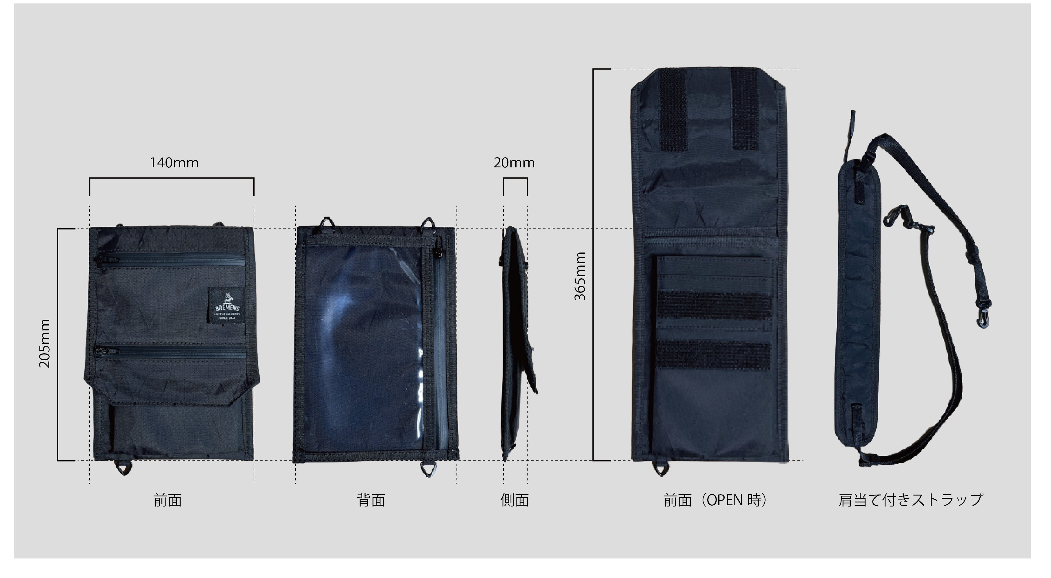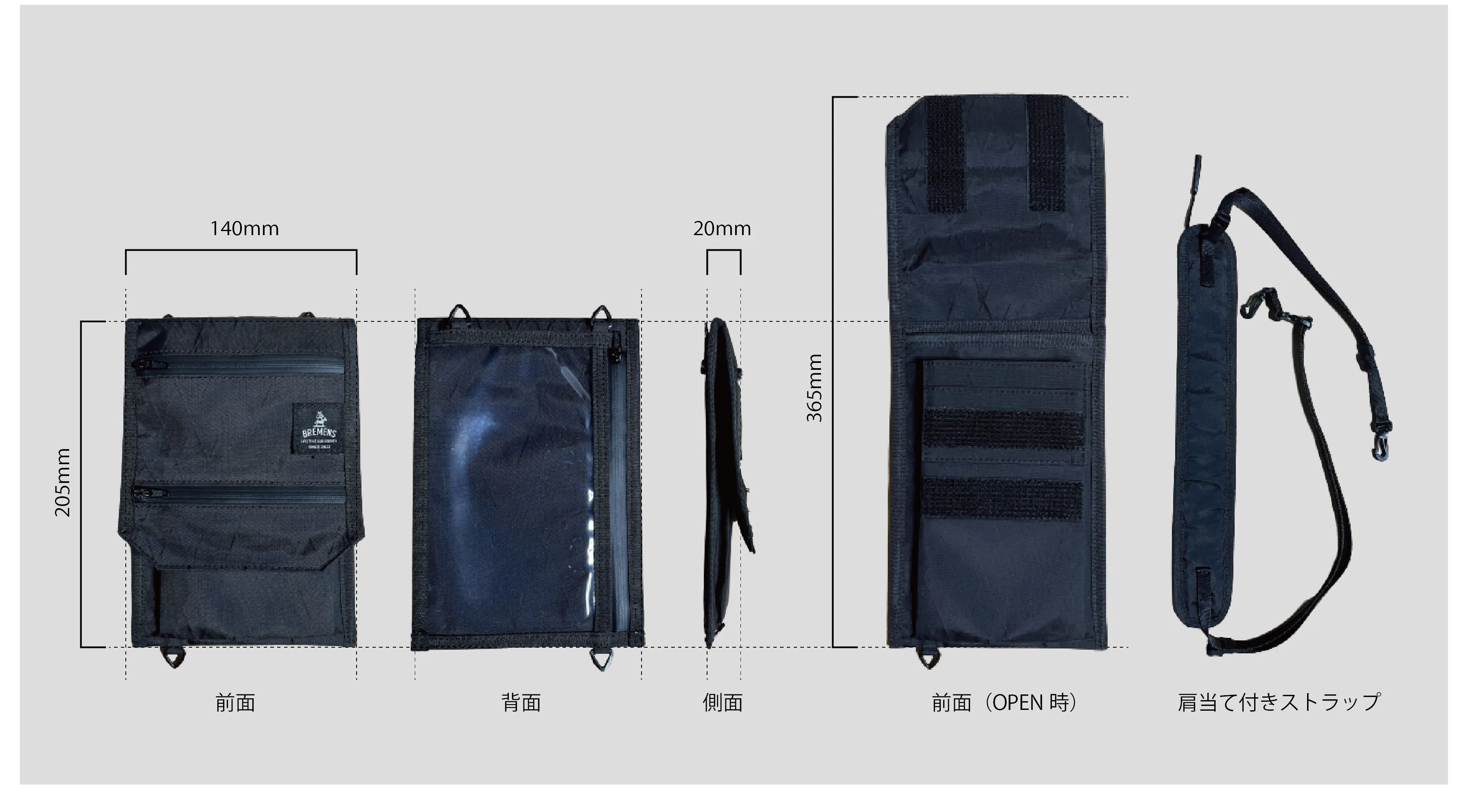 一番はじめに『欲しい機能』を紙に書き出すところからスタートしました。「スマホだけじゃななくて小銭やノートも入れたい」「パスポートと航空券をすっぽり収めたい」「電子書籍の端末や文庫本も入れたい」「隠しポケットを付けたい」「緊急用ホイッスルを付けたい」「必要に応じて縦型から横型にカスタムしたい」など。実際に日常生活で1年以上使いながら修正を重ね、本体ストラップ合わせて「15個」の試作品を製作しました。